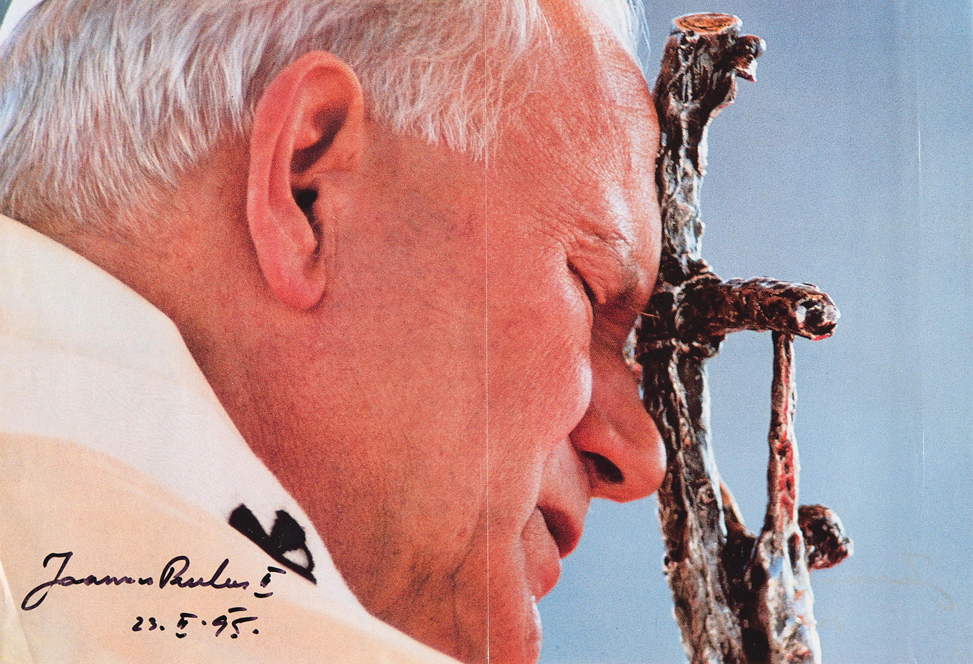 Annual ‘Man of the Year’ issue of Time Magazine from December 26, 1994/January 2, 1995, featuring a portrait of Pope John Paul II on the front cover, 158 pages, 8 x 10.5, signed inside on his fold-out image in black felt tip, “Joannes Paulus II, 23. II. 95.” In very good to fine condition, with a light vertical crease along the right side of the fold-out. The consignor notes that the signature was obtained in person for a private Papal audience in Vatican City in 1995.