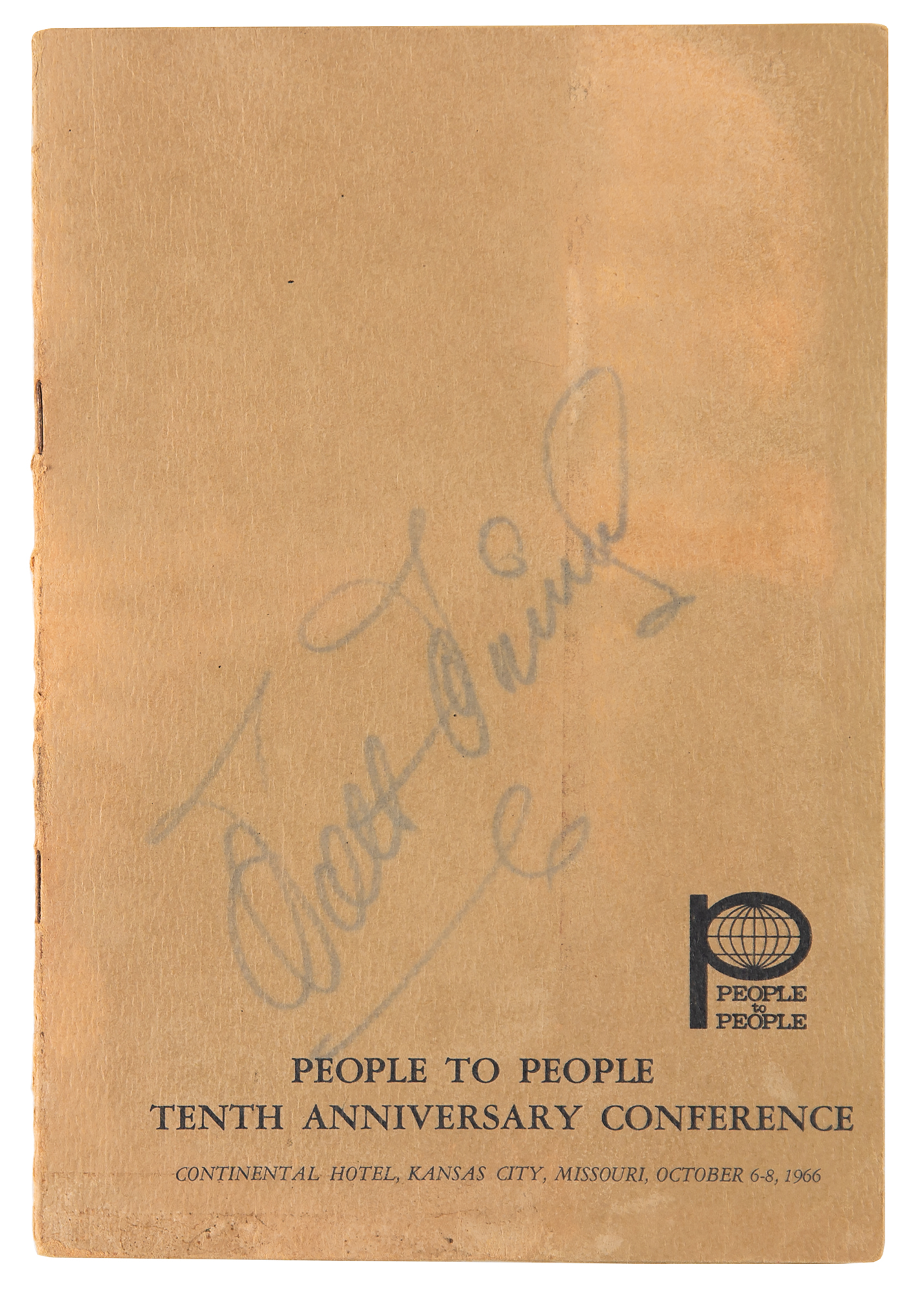 Program from the "People to People Tenth Anniversary Conference," held at the Continental Hotel, Kansas City, Missouri, on October 6–8, 1966, six pages, 5.5 x 8, signed on the front cover in ink by Walt Disney. On October 8th, Walt Disney, Bob Hope, and DeWitt Wallace were honored as special guests at the banquet, and were awarded with Distinguished Service Awards. In very good to fine condition, with toning and discoloration to the cover, rusted binding staples leading to somewhat loose inner pages, and various notations made by the attendee within.