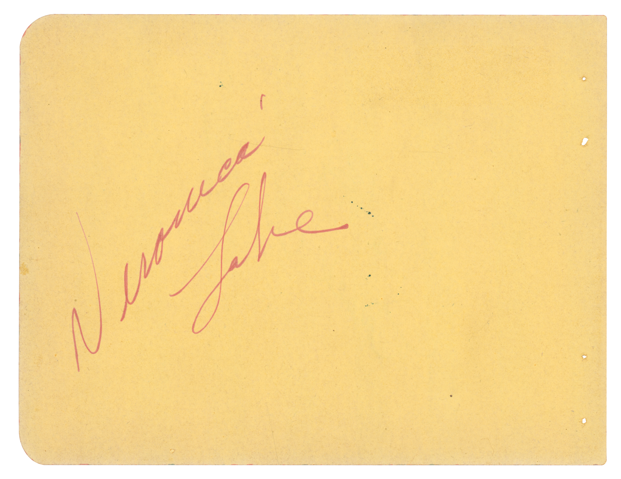 Vintage fountain pen signature, "Veronica Lake,” on a yellow 6 x 4.5 album page, also signed and inscribed on the reverse by Donald O'Connor. In fine condition.
