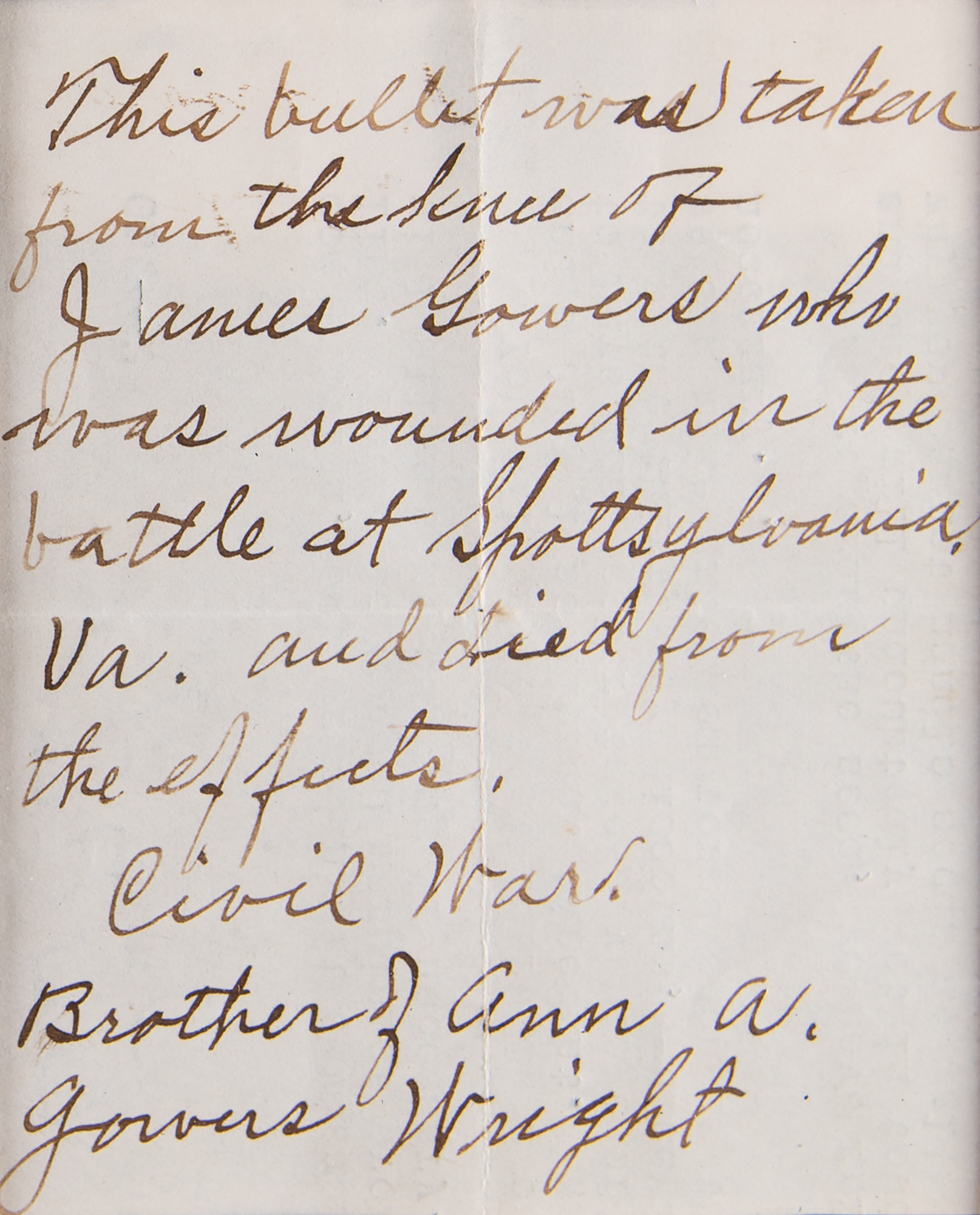 Displayed beside the diary is a bullet with a handwritten caption below, identifying it as that which caused Gowers' mortal wound. In full: "This bullet was taken from the knee of James Gowers who was wounded in the battle at Spottsylvania, Va. and died from the effects. Civil War. Brother of Ann A. Gowers Wright." Impressively mounted, suede-matted, and framed to an overall size of 21 x 22. In fine condition.