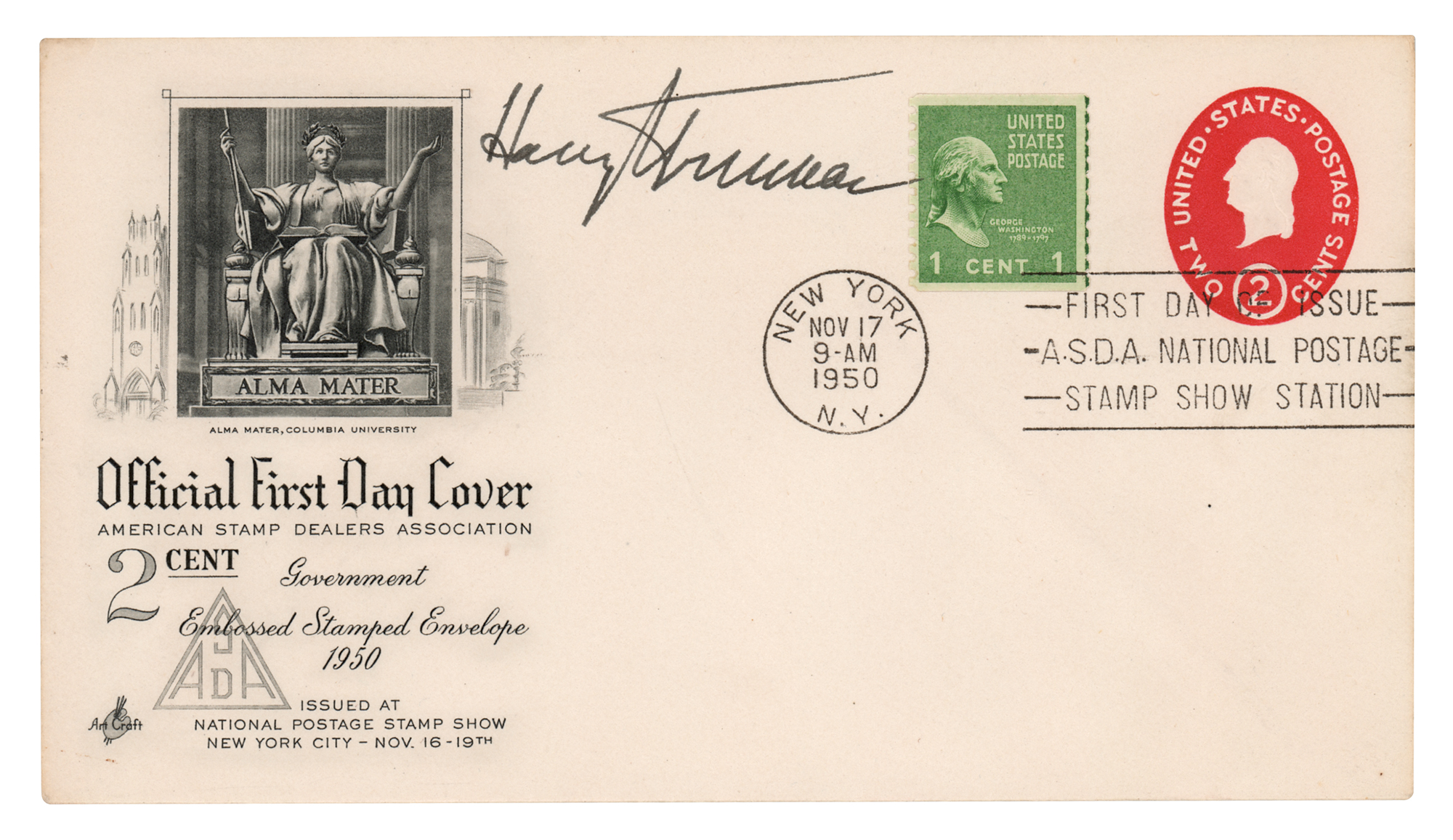 FDC with a cachet honoring the 'Alma Mater' sculpture at Columbia University, signed in fountain pen by Harry S. Truman. In fine condition.