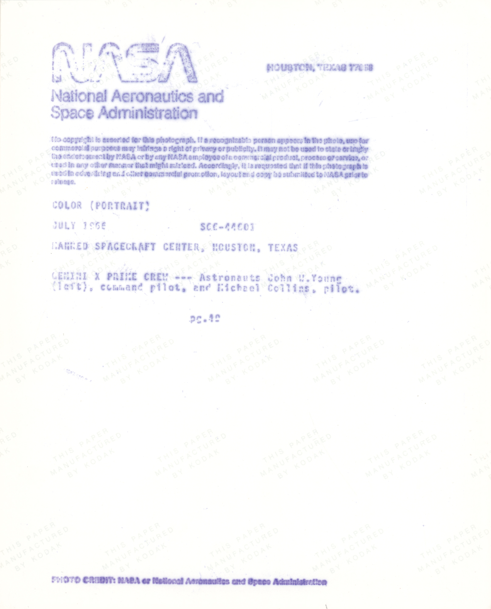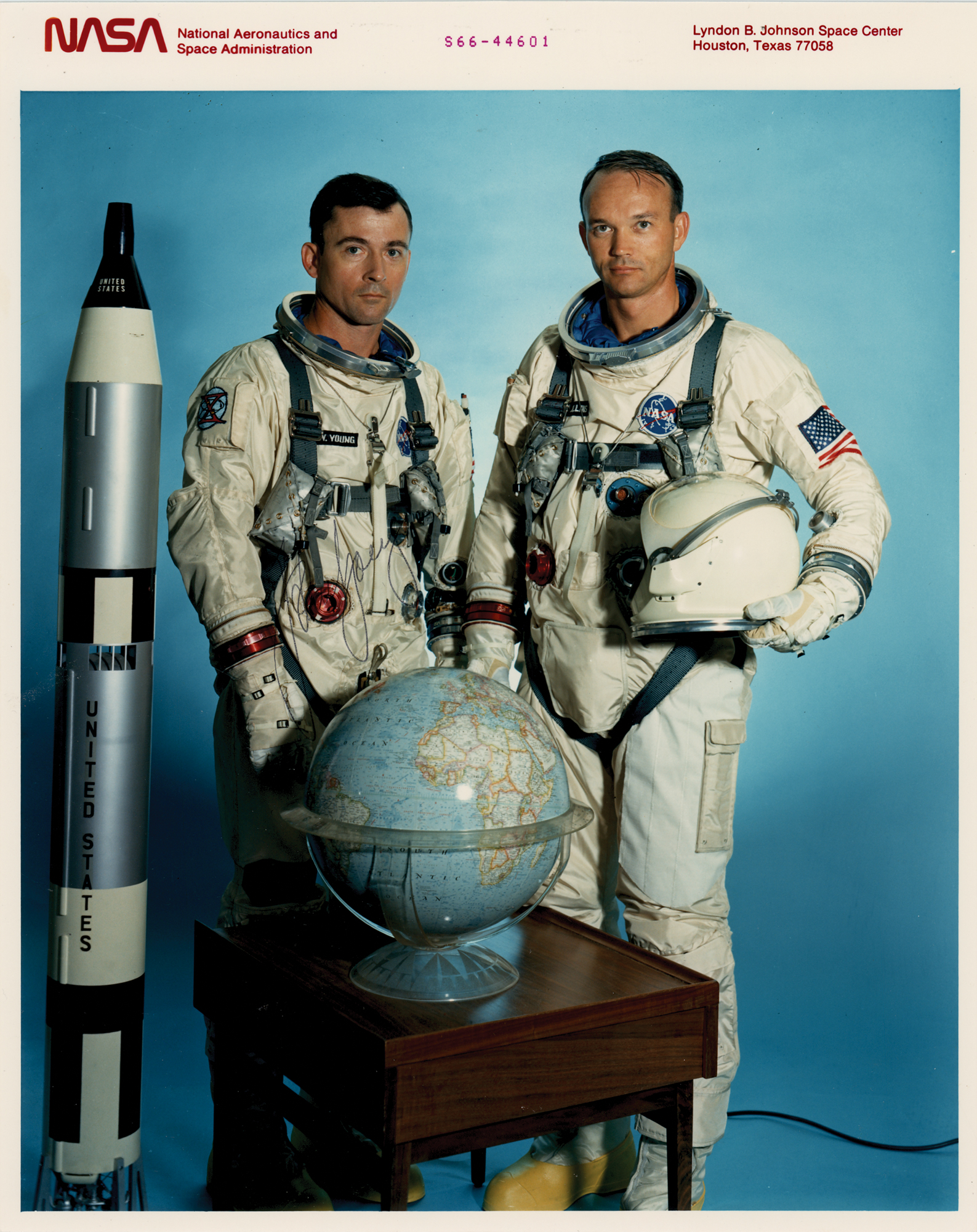 Official color satin-finish 8 x 10 red-numbered NASA photo of the Gemini 10 crew in their space suits, signed in black ballpoint by the Command Pilot, "John Young." Reverse bears blue NASA caption text and "This Paper Manufactured by Kodak" watermarks. In fine condition, with poor-to-moderate signature contrast.
