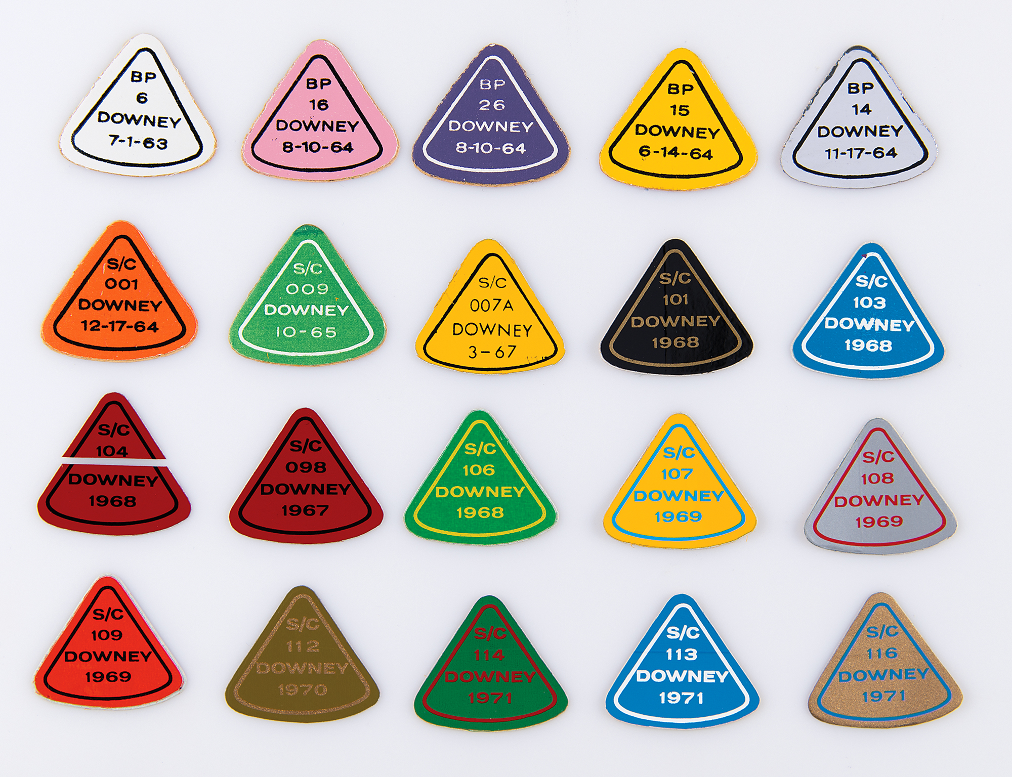 Collection of 20 colorful original vintage North American Rockwell Apollo Command Module mini decals, each measuring about 1.25˝ x 1.25˝, all including the date each spacecraft was completed at Downey, California. Includes boilerplate vehicles 6, 14, 15, 16, and 26; plus spacecrafts (S/C) 007A, 001, 009, 098, 101 (Apollo 7), 103 (Apollo 8), 104 (Apollo 9), 106 (Apollo 10), 107 (Apollo 11), 108 (Apollo 12), 109 (Apollo 13), 112 (Apollo 15), 113 (Apollo 16), 114 (Apollo 17), and 116 (Skylab 2). In overall fine condition, with the "S/C 104" decal split in half.