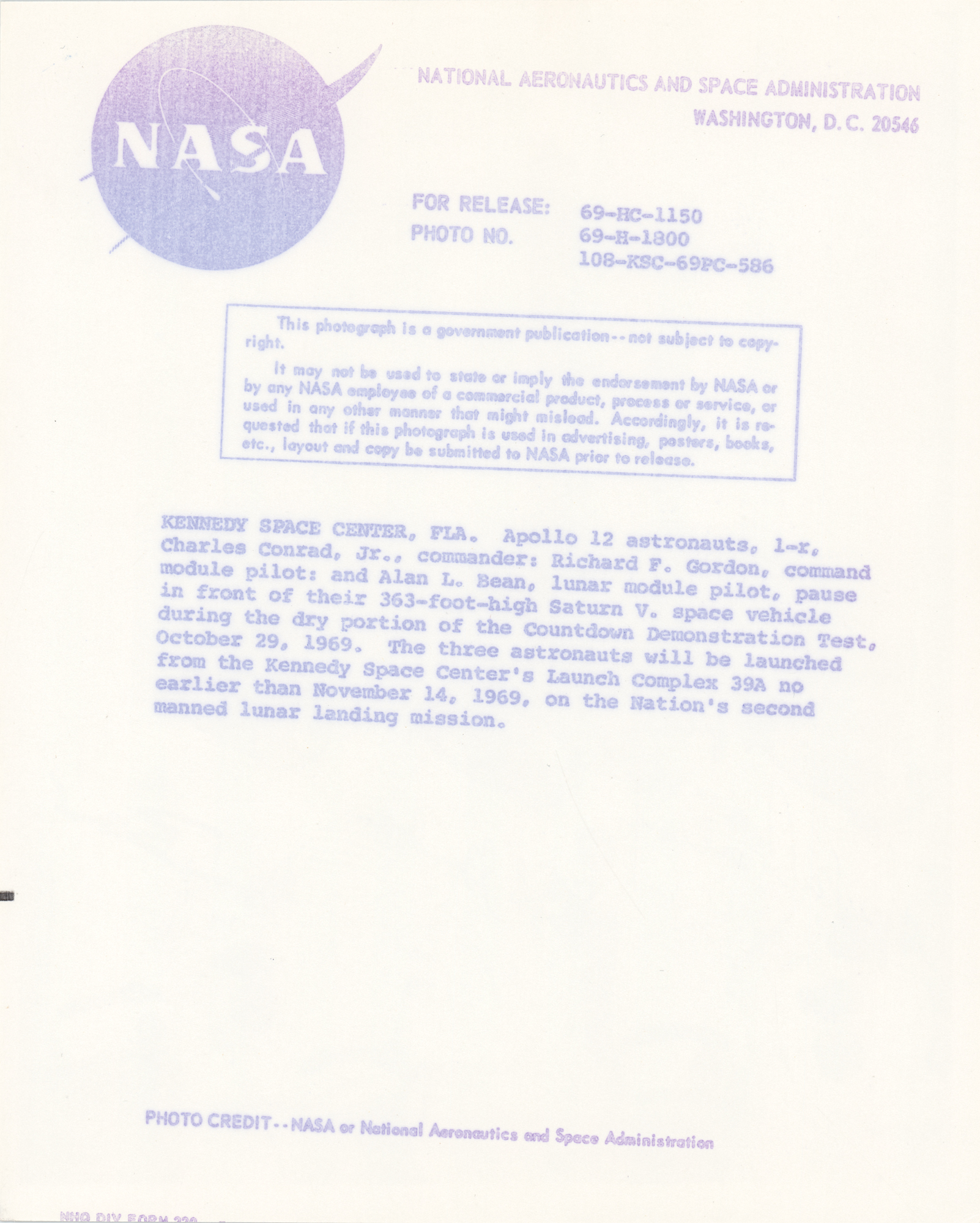 Official glossy 8 x 10 NASA press photo of the Apollo 12 astronauts in their white space suits, posing in front of the Saturn V launch vehicle at Pad 39A, signed in black felt tip by Alan Bean, Charles Conrad, and Richard Gordon. Reverse bears blue mimeographed NASA caption text. In very fine condition, with light show-through from the printed NASA info on the back.