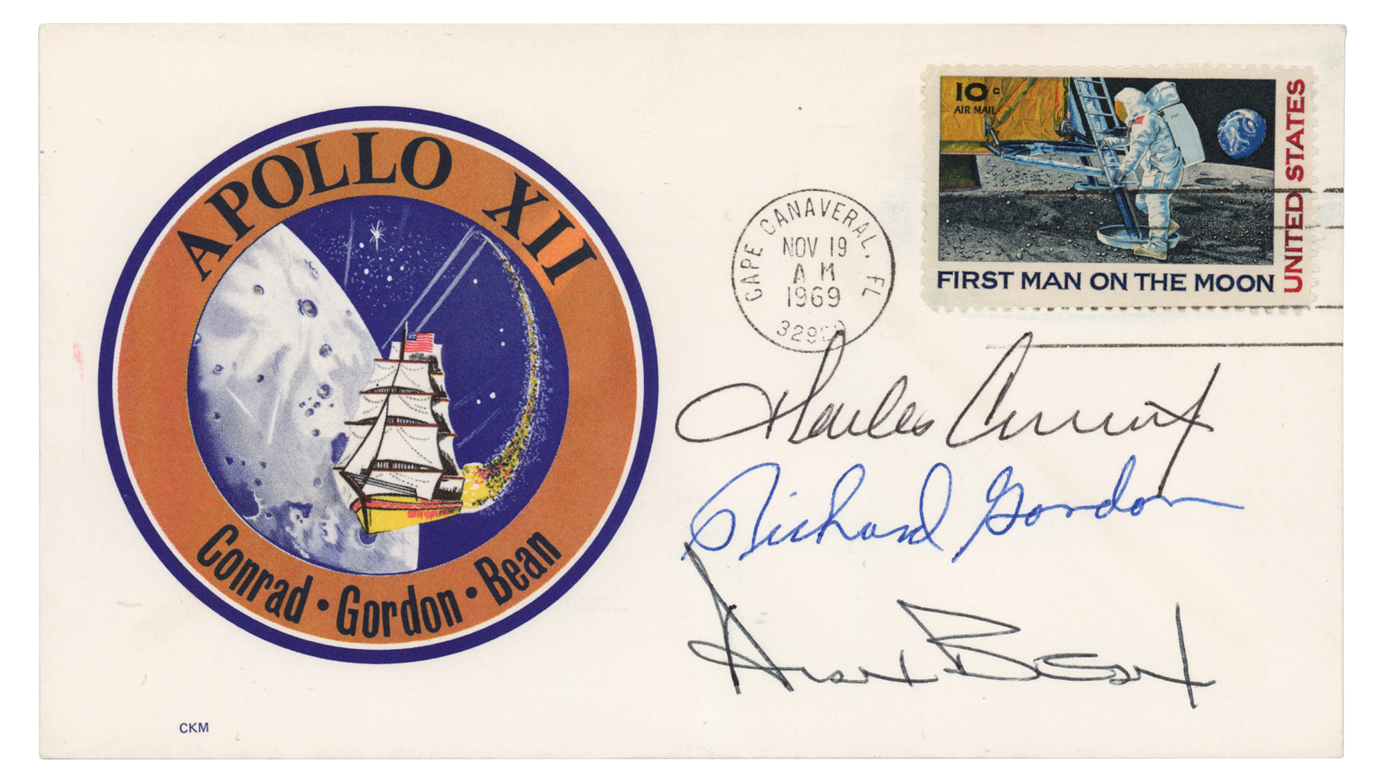Commemorative 'lunar landing day' cover with a color cachet of the Apollo 12 mission insignia, postmarked at Cape Canaveral on November 19, 1969, signed in black ballpoint by Charles Conrad and Alan Bean, and in blue ballpoint by Richard Gordon. In very fine condition.