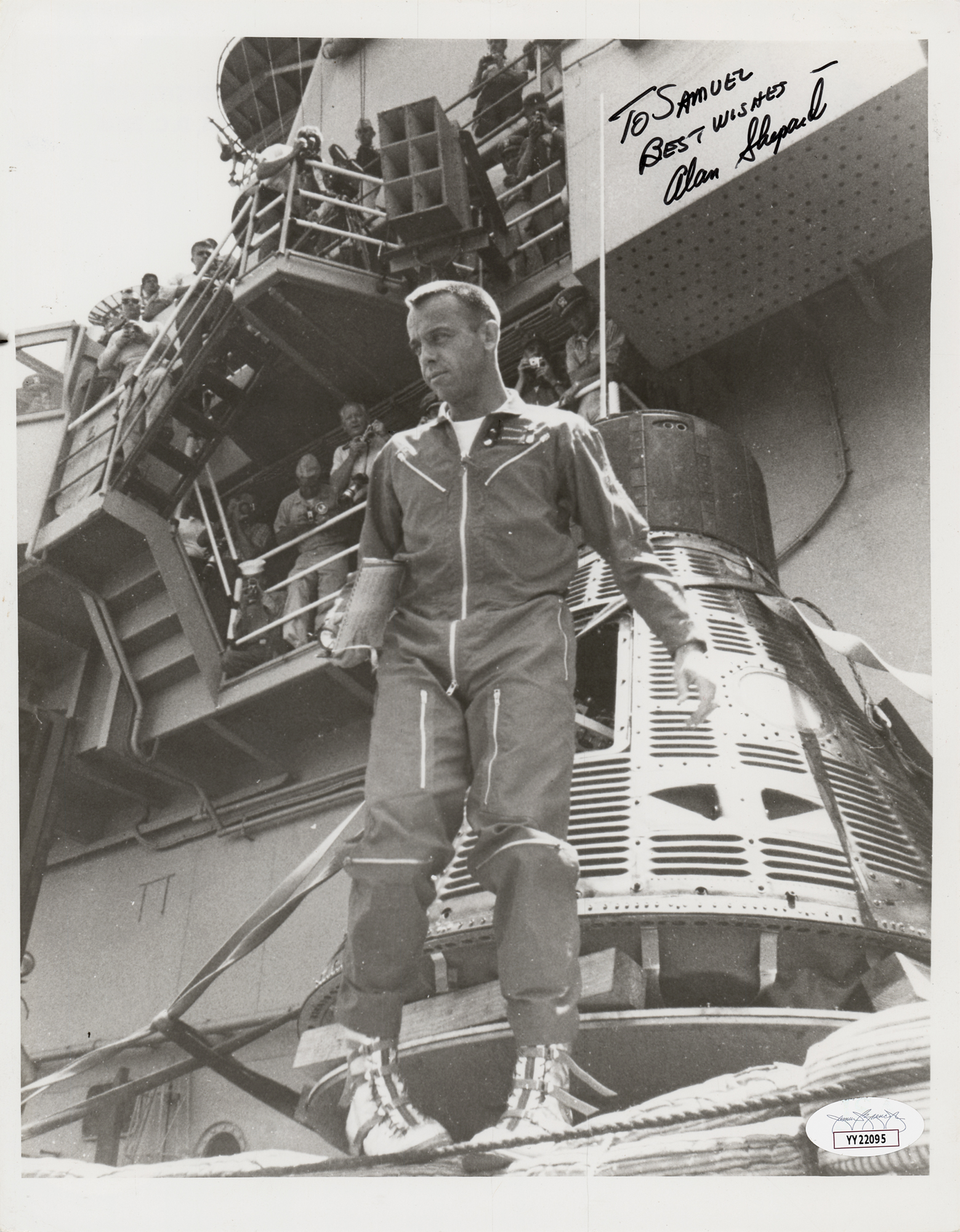 Glossy 8 x 10 photo of Alan Shepard in front of the Freedom 7 on the USS Lake Champlain after his historic Mercury-Redstone 3 flight, signed and inscribed in black felt tip, "To Samuel, Best Wishes—Alan Shepard.” In fine condition. Accompanied by a full letter of authenticity from JSA.
