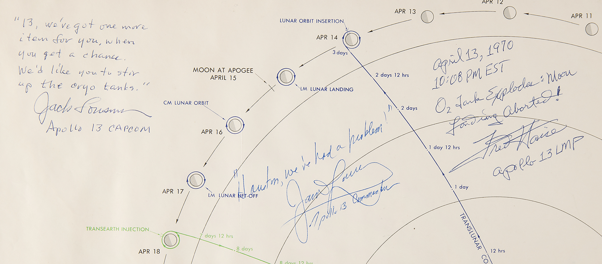 First edition color ‘Apollo Translunar/Transearth Trajectory Plotting Chart’ for the Apollo 13 mission, 24 x 20, dated March 16, 1970, displaying a polar view of the lunar mission profile for Apollo 13, showing the various significant events during the 10-day mission. Signed in ballpoint, “James Lovell, Apollo 13 Commander,” who adds “‘Houston, we’ve had a problem!,’” “Fred Haise, Apollo 13 LMP,” who adds, “April 13, 1970, 10:08 EST, O2 Tank Explodes: Moon Landing Aborted!,” and “Jack Lousma, Apollo 13 CAPCOM,” who adds above, “‘13, we’ve got one more item for you, when you get a chance. We’d like you to stir up the cryo tanks.’” Lithographed by ACIC 3-70, and prepared under the direction of the Department of Defense by the Aeronautical Chart and Information Center. Rolled and in fine condition.