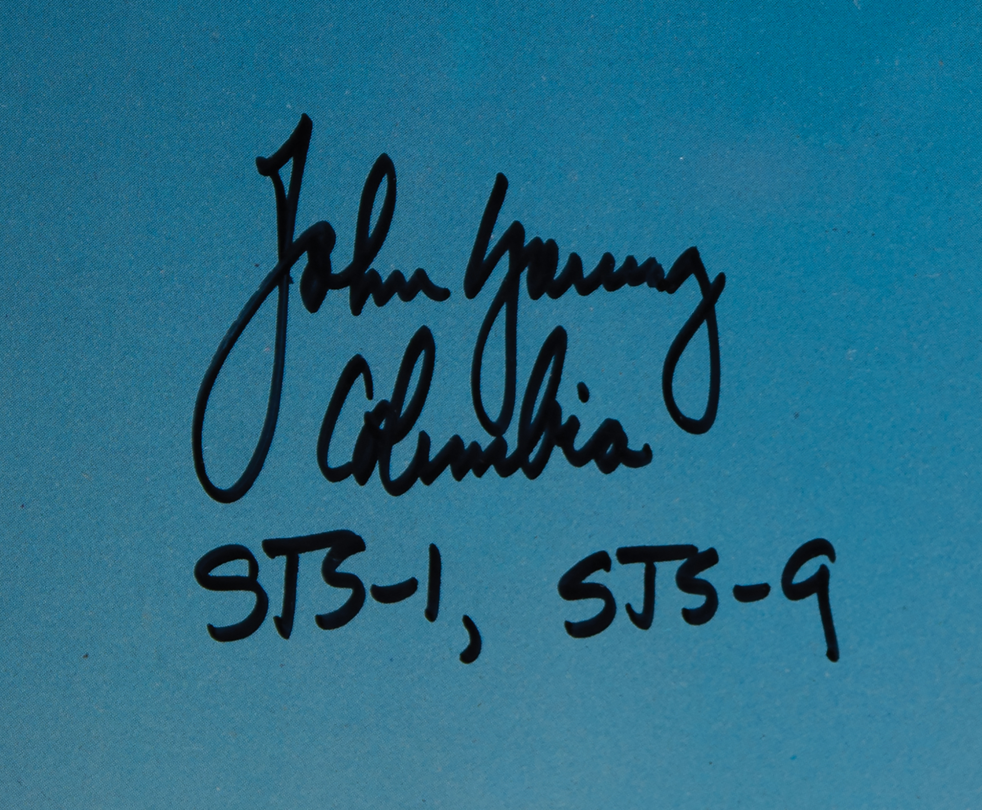 Color 16.75 x 21.5 poster of a Kim Poor painting entitled 'Morning Launch,' which shows the Space Shuttle Orbiter Columbia rising through the clouds, signed in black felt tip, "John Young, Columbia, STS-1, STS-9." Rolled and in fine condition, with a small surface scratch to the upper background area. Accompanied by a certificate of authenticity from Novaspace.