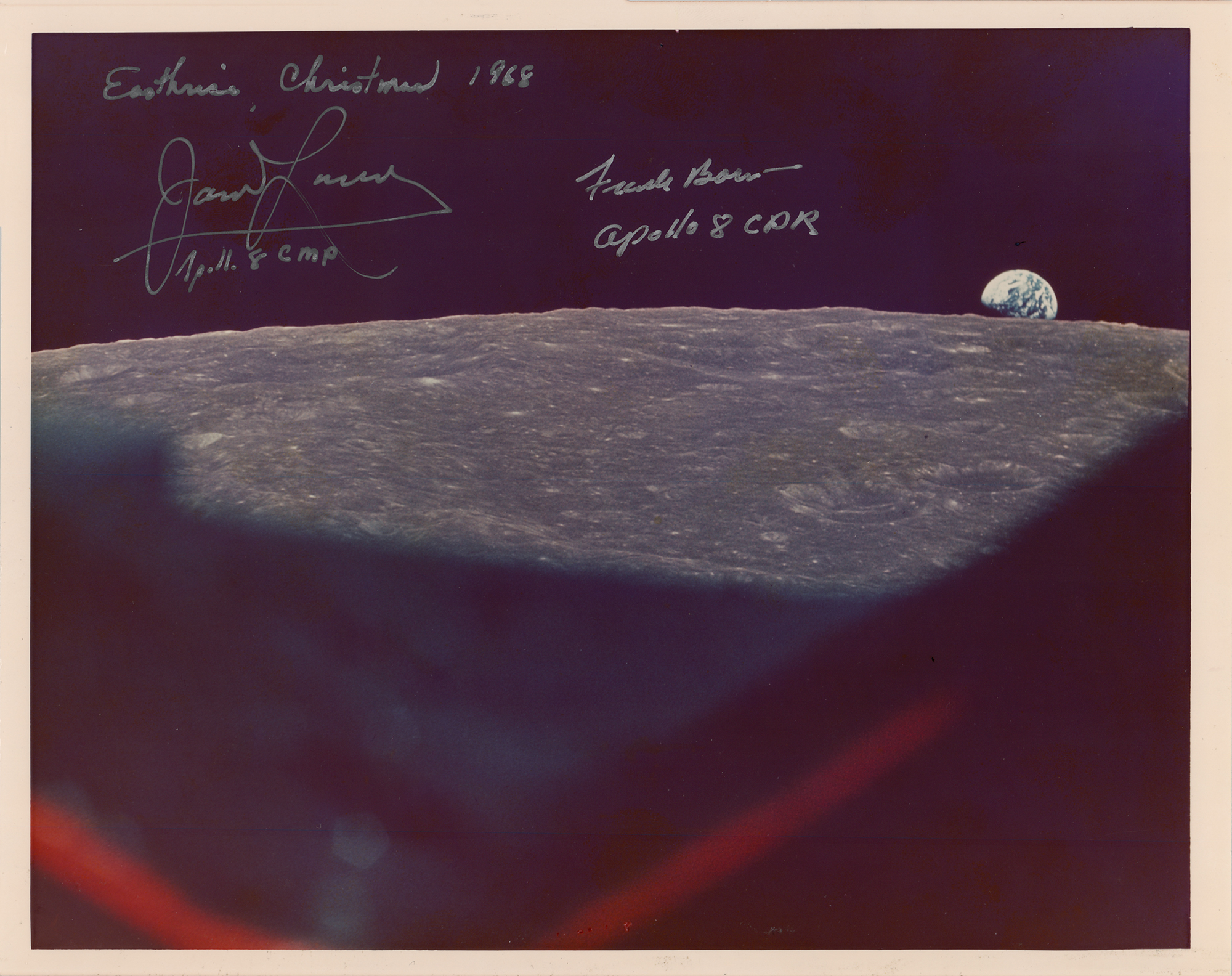 Official color glossy 10 x 8 NASA photo of the Earth as seen by the Apollo 8 crew after performing lunar orbit insertion burn, signed in silver ink, "Frank Borman, Apollo 8 CDR" and "James Lovell, Apollo 8 CMP," who adds above, "Earthrise, Christmas 1968." The reverse bears faded NASA caption text and "This Paper Manufactured by Kodak" watermarks. In fine condition.