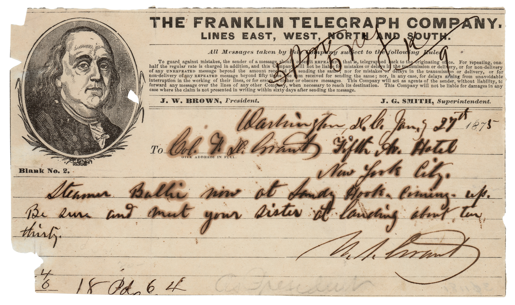 Autograph telegram as president, signed “U. S. Grant,” one page, 7 x 4, Franklin Telegraph Company letterhead, January 27, 1875. Handwritten telegram from "Washington, D.C.," penned by Grant during his presidency, to his son, "Col. F. D. Grant," in part: "Steamer Balhi now at Sandy Hook, coming up. Be sure and meet your sisters at launching about ten thirty." In very good to fine condition, with haloing to the handwritten text, and small areas of paper loss affecting none of Grant's handwriting. An interesting handwritten piece by President Grant as he tends to both family affairs and matters of state.