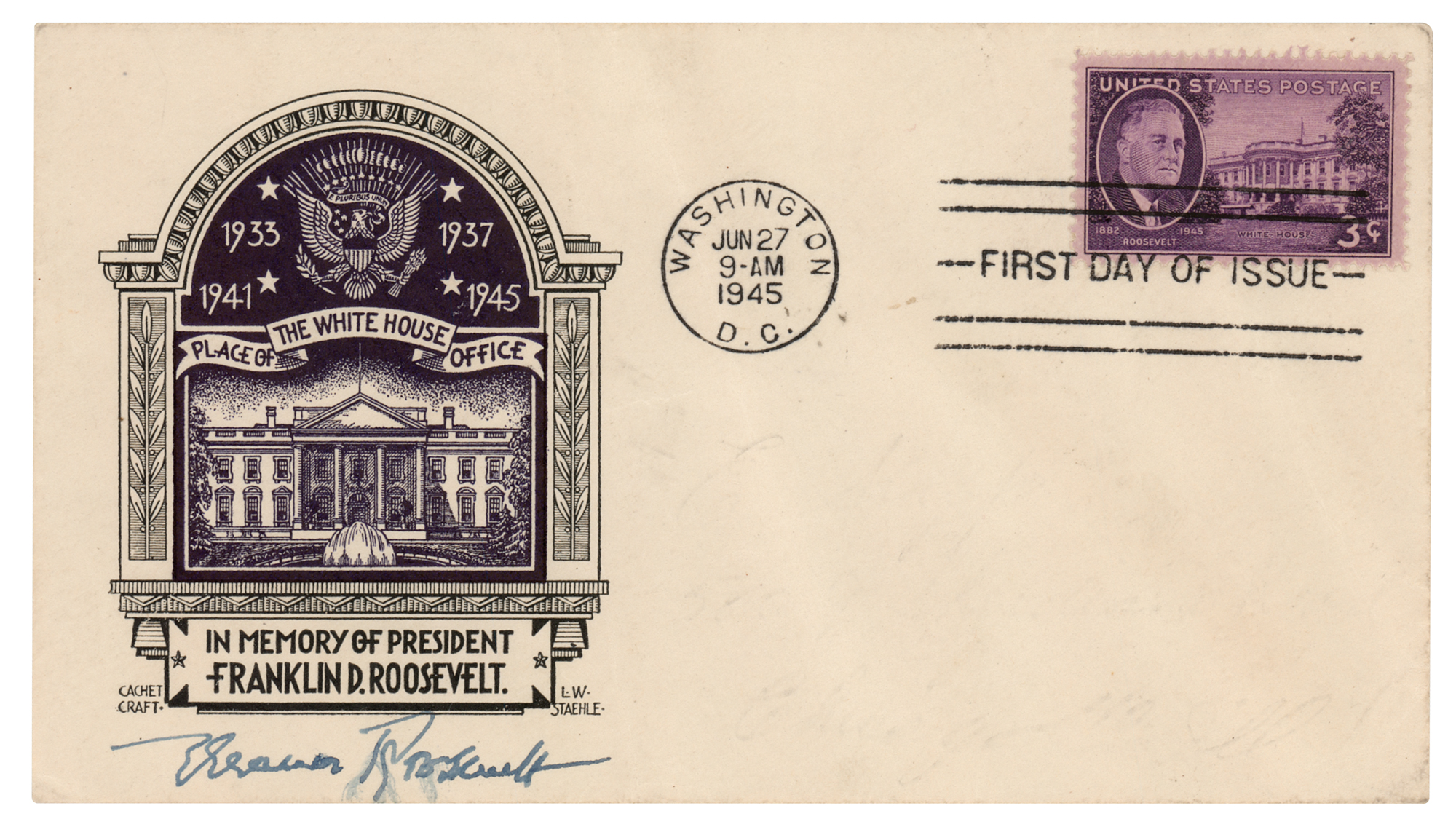 FDC with a cachet honoring the memory of the late Franklin D. Roosevelt, signed in fountain pen, "Eleanor Roosevelt." In very good to fine condition, with light diagonal creasing, and a brush to the ink in her signature.