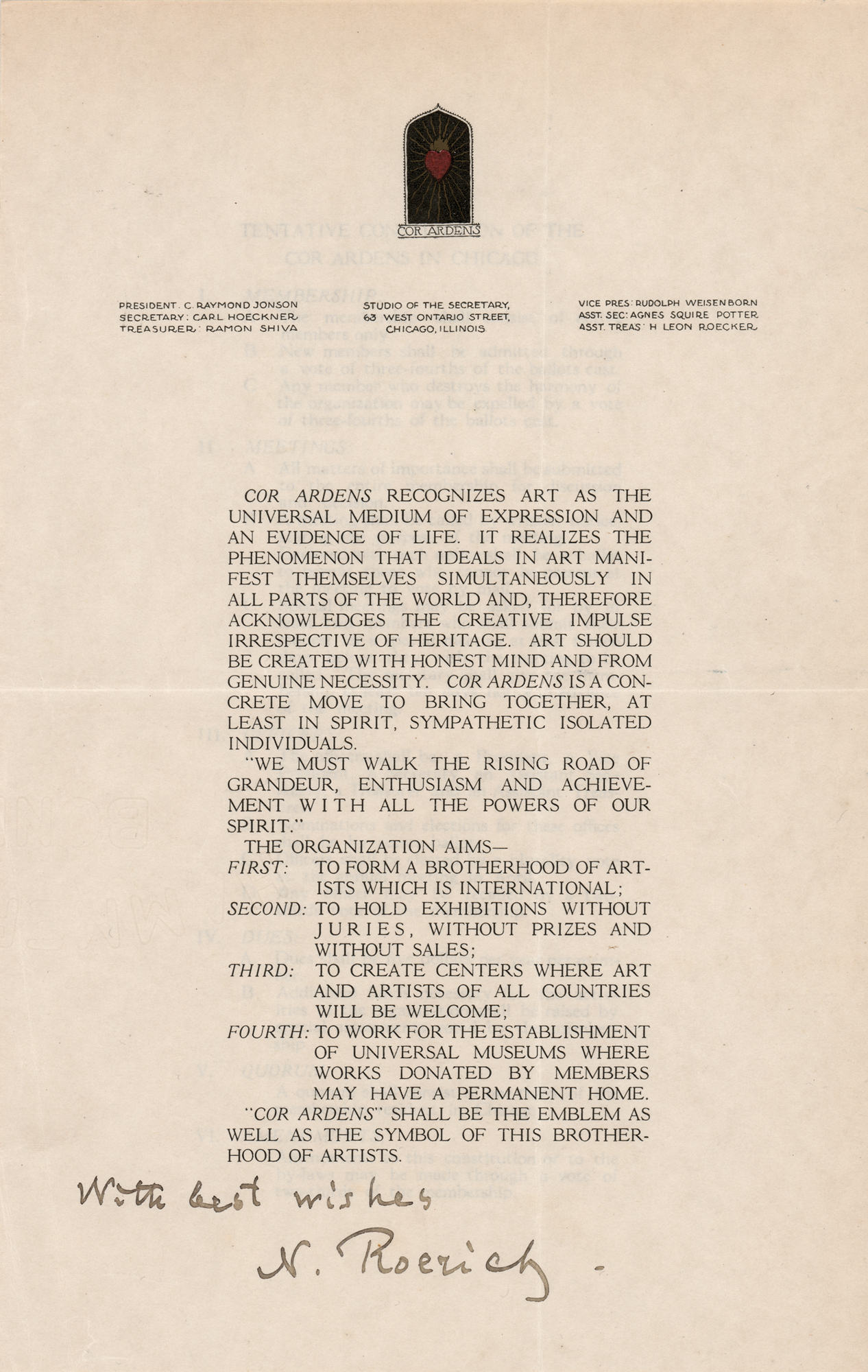 Russian painter, writer, archaeologist, theosophist, and philosopher (1874–1947) who was a dedicated activist for the cause of preserving art and architecture during times of war. Leaflet explaining the mission of the 'Cor Ardens' artist's fraternity, two pages, 7.25 x 11, signed at the bottom in fountain pen, "With best wishes, N. Roerich." The text begins: "Cor Ardens recognizes art as the universal medium of expression and an evidence of life. It realizes the phenomenon that ideals in art manifest themselves simultaneously in all parts of the world and, therefore acknowledges the creative impulse irrespective of heritage." In fine condition.