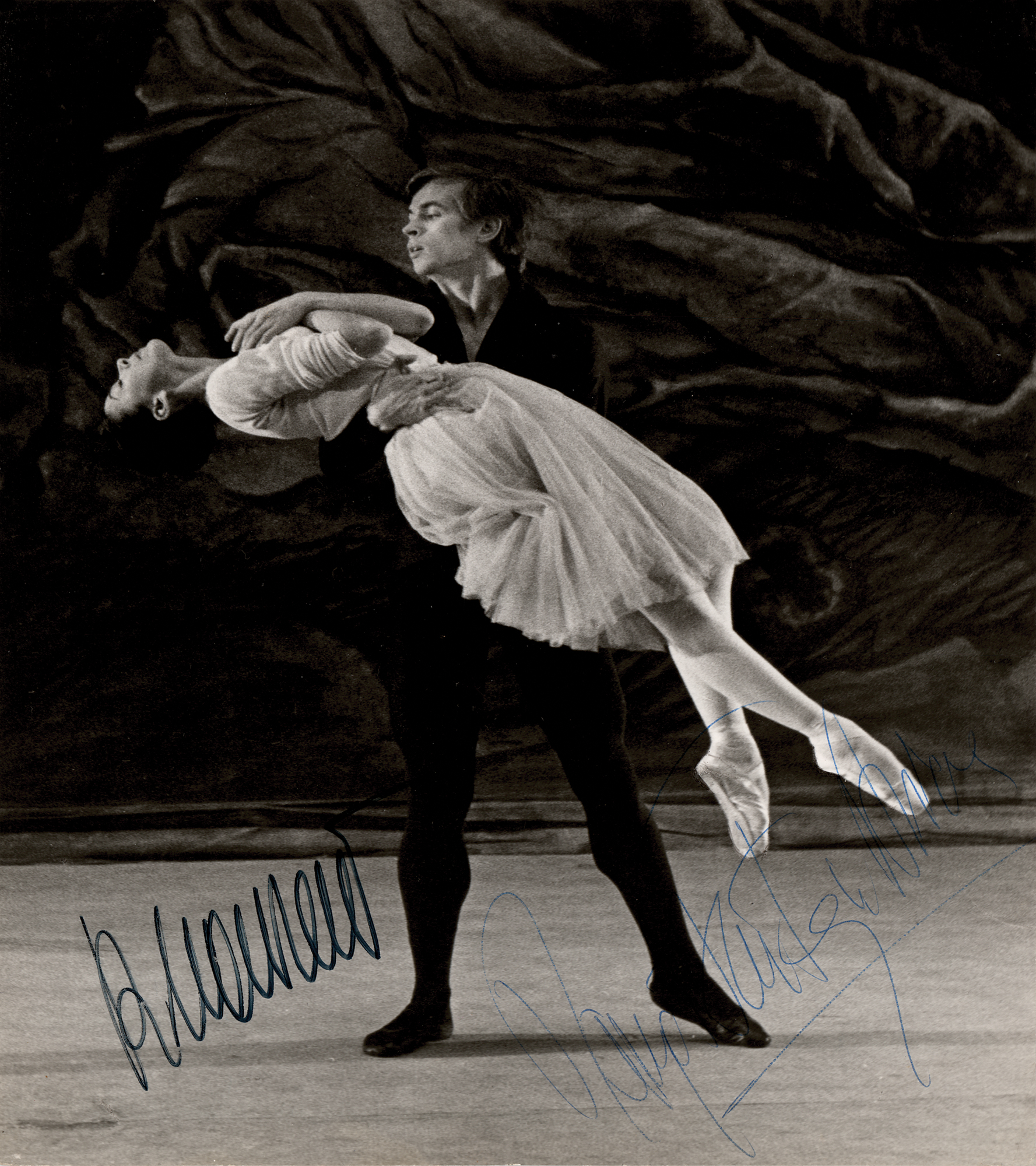 Glossy 7.75 x 9.75 photo of Rudolf Nureyev and Margot Fonteyn dancing together, signed in black felt tip by Nureyev and in blue ballpoint by Fonteyn. Reverse bears a Houston Rogers credit stamp. In fine condition.