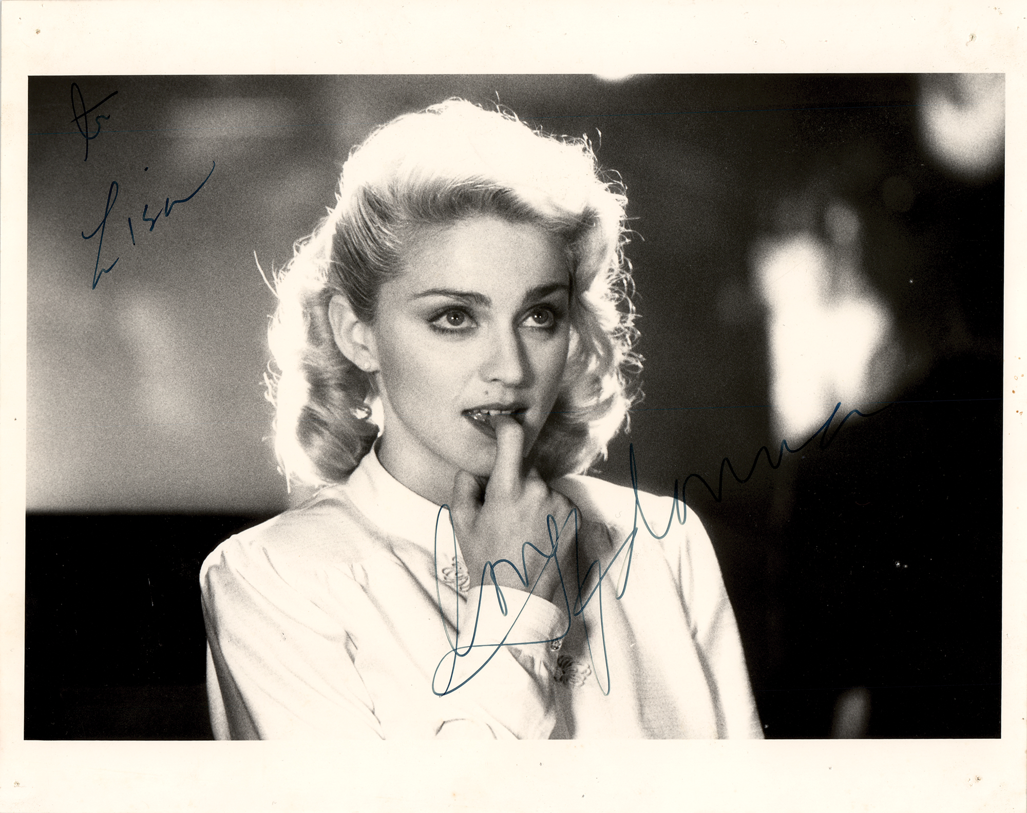 Satin-finish 10 x 8 photo of Madonna as Gloria Tatlock in the 1986 film Shanghai Surprise, signed in felt tip, “Love, Madonna.” An unknown hand has added an inscription to the upper left. The consignor notes that the autograph was obtained on the London set of Shanghai Surprise during filming in 1986. In fine condition, with small tack holes to the corners.