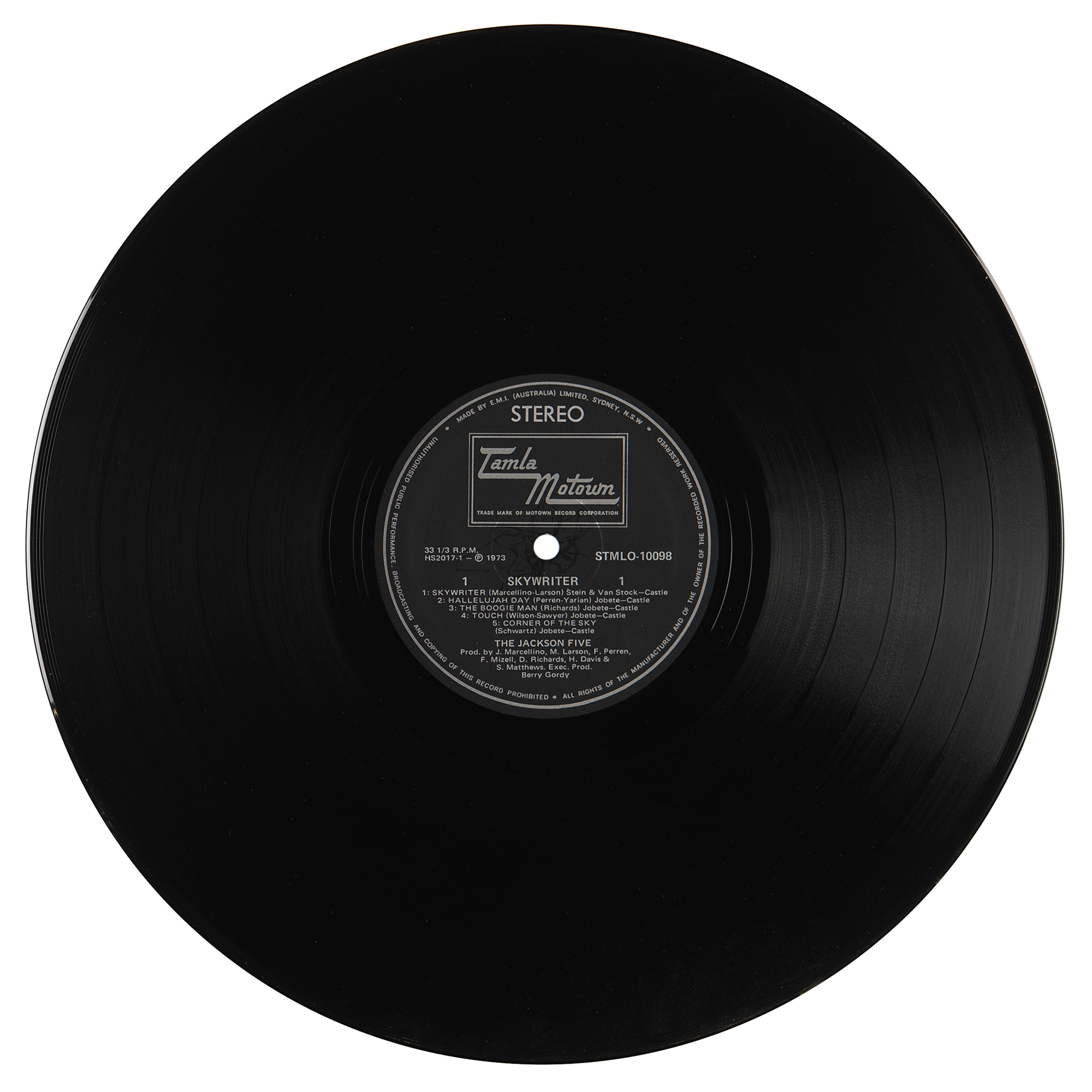 Australian vinyl pressing of the 1973 Jackson 5 album Skywriter, signed on the front cover in black ballpoint, “Love, Michael Jackson,” “Peace & Love, Jackie Jackson,” “Jermaine Jackson,” “Randy Jackson,” “Tito Jackson, Love always,” and “Love, Marlon.” The consignor notes that the album was signed for the president of the local Jackson Five Fan Club at the Park Royal Hotel in Brisbane, Australia, in late June 1973. This was not only the Jacksons' first tour of Australia and New Zealand, but they were the first black artists to tour the countries and record concert attendances of over 2 million people. Between June 23 and July 5, the band played in Brisbane, Melbourne, Perth, Adelaide, and Sydney, Australia, and in Christchurch and Wellington, New Zealand. In fine condition. The record is included. Accompanied by a certificate of authenticity from Tracks and by a letter of provenance from the father of the original recipient: “The Michael Jackson hit ‘Ben’ was the catalyst for a surge in popularity for The Jacksons in Australia, and my teenage daughter, Cheryl, wrote to one of the local radio stations in response to efforts by the station to organize a following for the group, under their auspices.