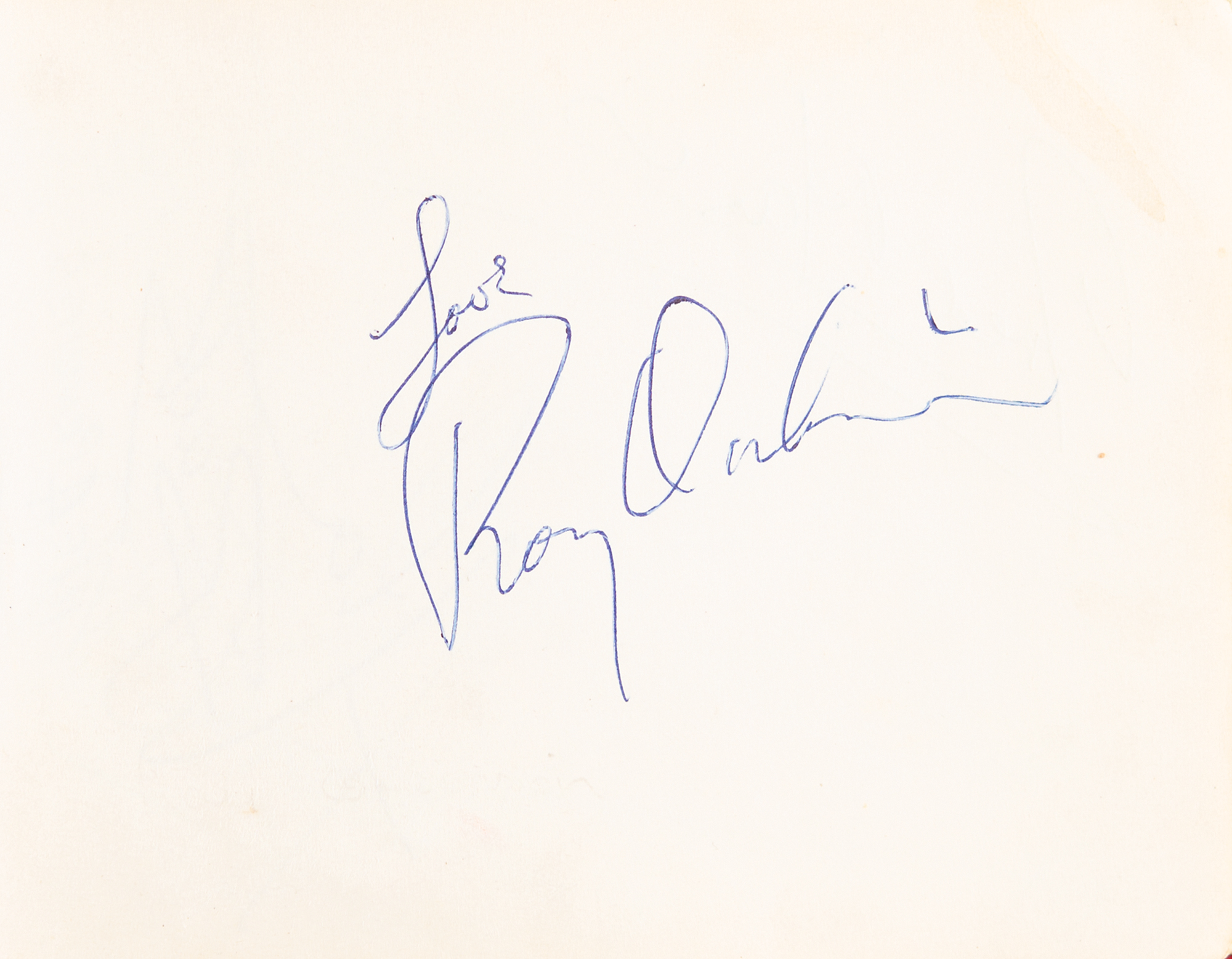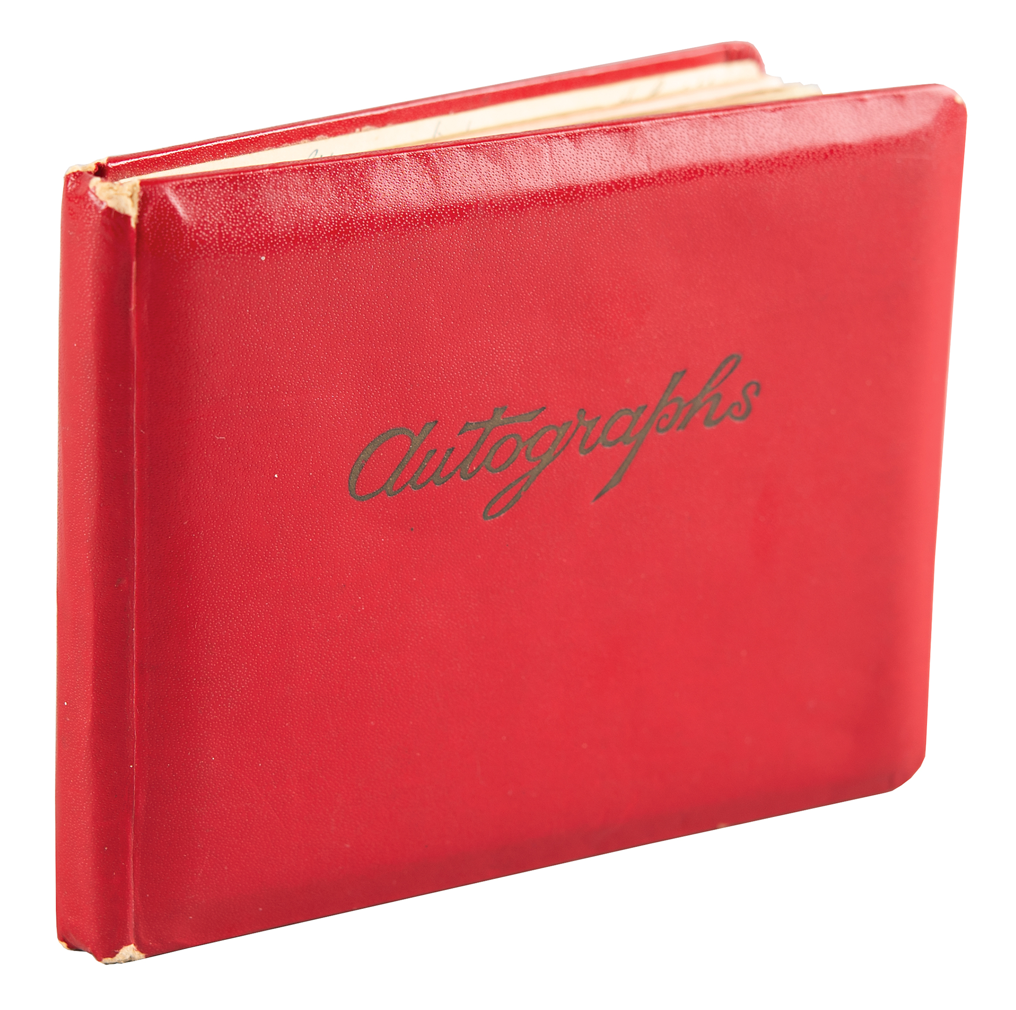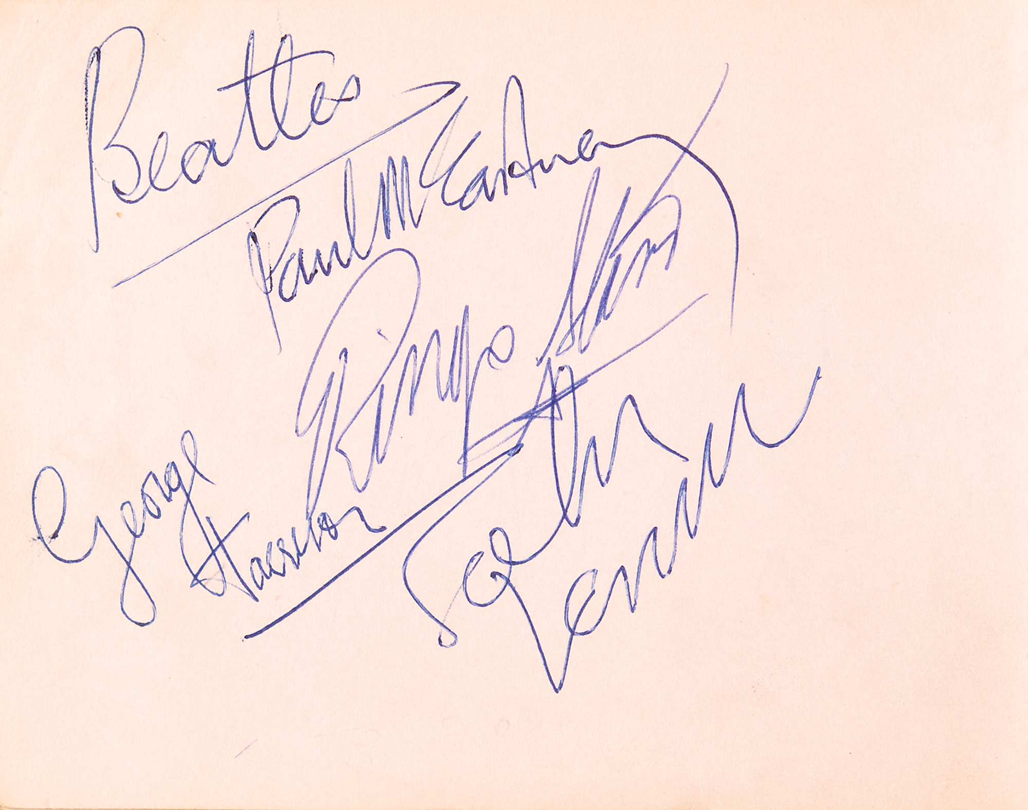 Vintage red 1960s leather-bound autograph book, 5.25 x 4.25, signed inside on the same page in blue ballpoint: “Beatles, Paul McCartney,” “Ringo Starr,” “George Harrison,” and “John Lennon.” The adjacent page is signed by one-time touring partner Roy Orbison; the balance of the book contains autographs of Gerry Marsden, Freddie and the Dreamers, Billy J. Kramer, the 4 Pennies, the Undertakers, and Cilla Black. The consignor notes that the Beatles signatures were obtained at King George’s Hall in Blackburn, Lancashire, England on June 9, 1963, the final date in the Beatles’ UK tour with Orbison; incidentally, the lyric ‘4000 holes in Blackburn Lancashire’ was also part of the 1967 Beatles song ‘A Day in the Life,’ which appeared on the group’s 1967 album Sgt Pepper's Lonely Hearts Club Band. In fine condition. Accompanied by a certificate of authenticity from Tracks.