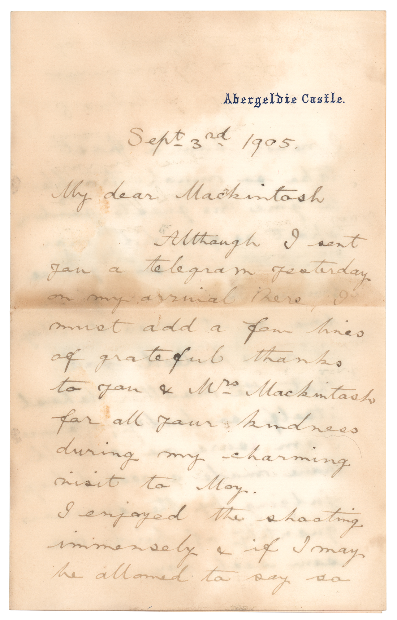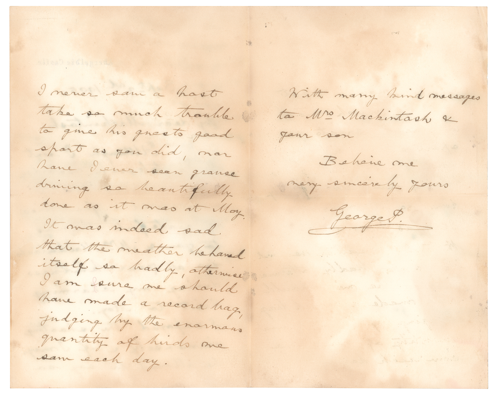 ALS signed “George P.,” three pages on two adjoining sheets, 4.5 x 7, Abergeldie Castle letterhead, September 3, 1905. Handwritten letter to Robert Mackintosh, in part: “Although I sent you a telegram yesterday on my arrival here, I must add a few lines of grateful thanks to you & Mrs. Mackintosh for all your kindness during my charming visit to Moy. I enjoyed the shooting immensely & if I may be allowed to say so I never saw a host take so much trouble to give his guests good sport as you did, nor have I ever seen grouse driving so beautifully done as it was at Moy.” In very good to fine condition, with irregular overall staining.