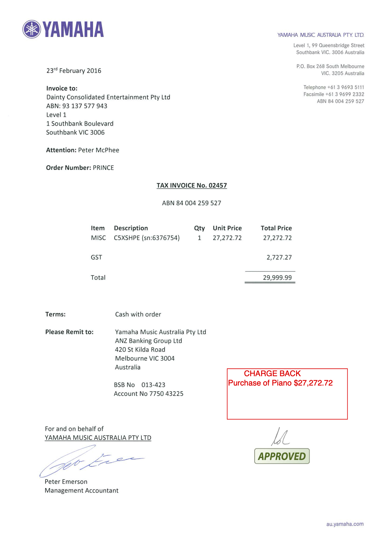 Prince's stage-used black Yamaha C5 grand piano from the Australia/New Zealand leg of the 'Piano & a Microphone Tour,' played during his shows in Melbourne, Sydney, and Auckland from February 16–24, 2016. The piano is serial no. X6376754, and originates from the collection of Prince's tour promoter. Renowned for their delicate attack, rich harmonics, and beautiful resonance, Yamaha's C-series pianos are the most widely recorded pianos in the music industry: the C5 grand piano features a large 6' 7" cabinet that offers increased volume and boldness, and was Prince's personal choice for the Piano & a Microphone Tour—concert series that focused exclusively on his voice and his instrument. In addition to his two shows at the Sydney Opera House, Prince played this piano at the State Theatre in Melbourne, the State Theatre in Sydney, and the ASB Theatre in Auckland. Accompanied by a letter of provenance from the consignor.