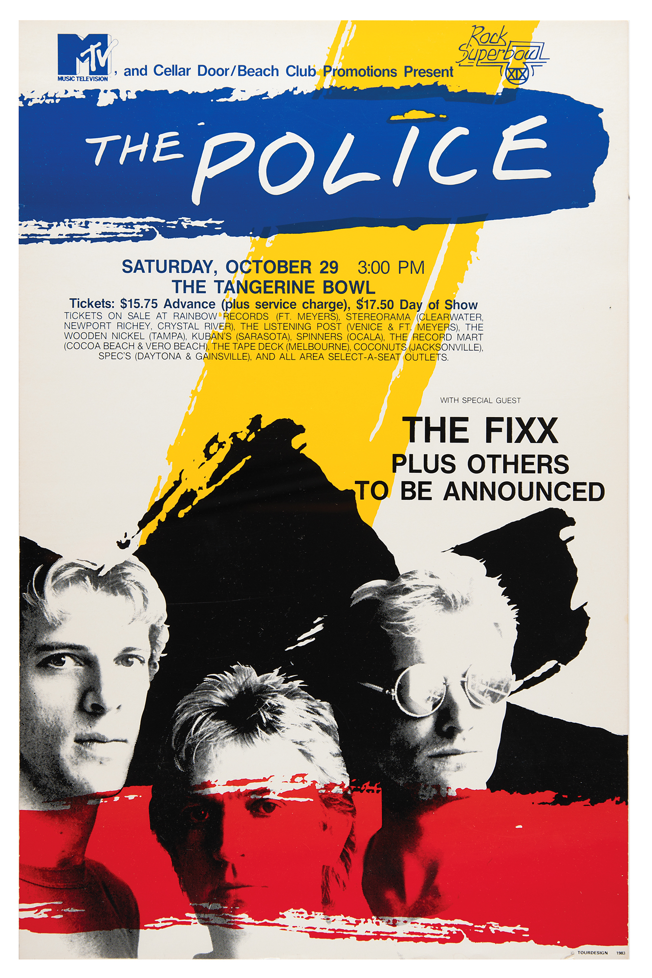 Original color 14.25 x 22 concert poster for The Police at the Tangerine Bowl in Orlando, Florida, on October 29, 1983, presented by MTV and Cellar Door/Beach Club Promotions. The Fixx and Eric Burdon and the Animals also performed as part of 'Rock Super Bowl XIX.' Rolled and in fine condition.