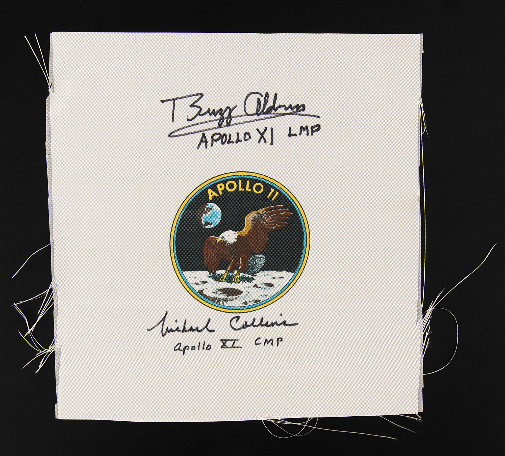 Fantastic 9 x 9 swatch of Beta cloth bearing the Apollo 11 mission insignia at center, signed in black felt tip, "Buzz Aldrin, Apollo XI LMP" and "Michael Collins, Apollo XI CMP." In fine condition. An uncommon and desirable dual-signed format representing the historic first moon landing mission.