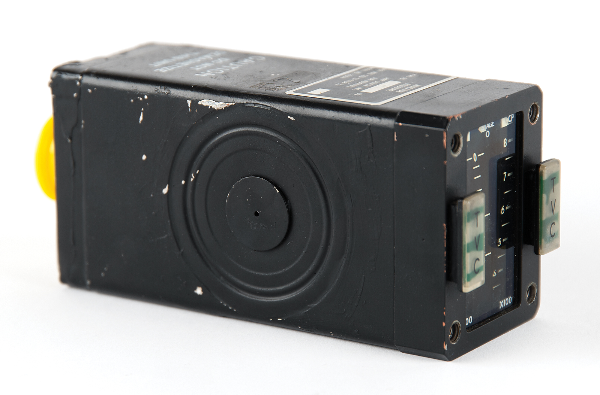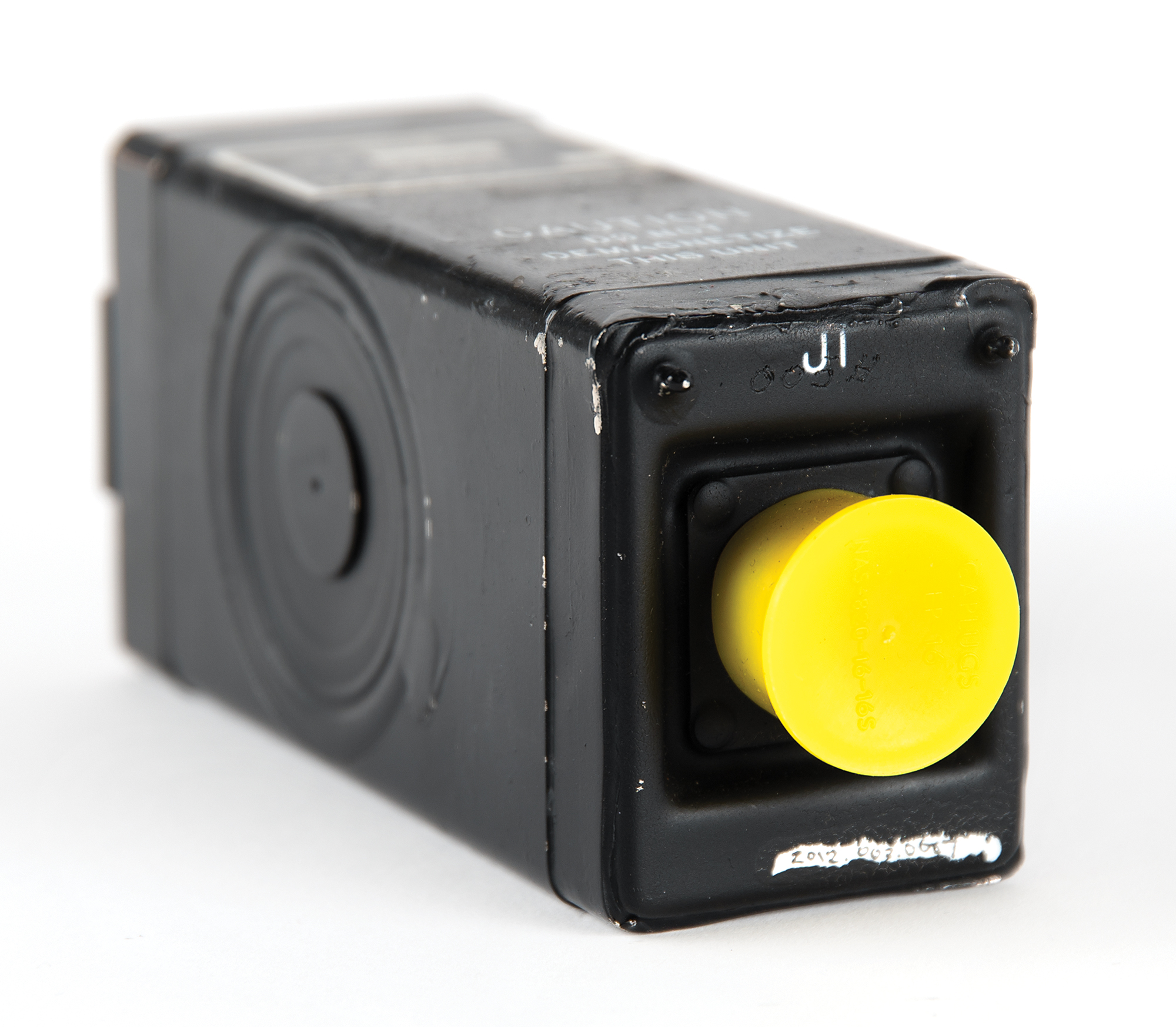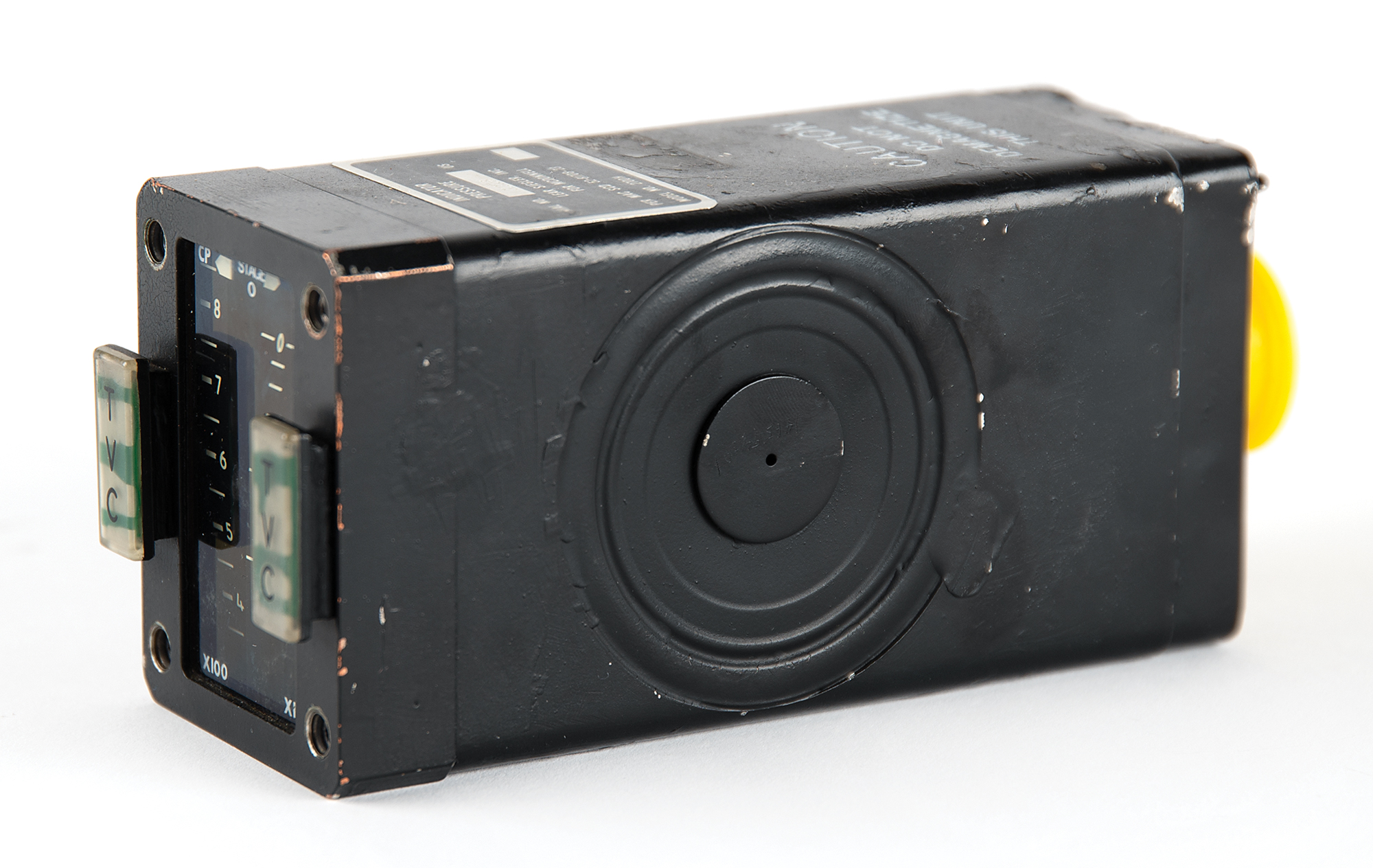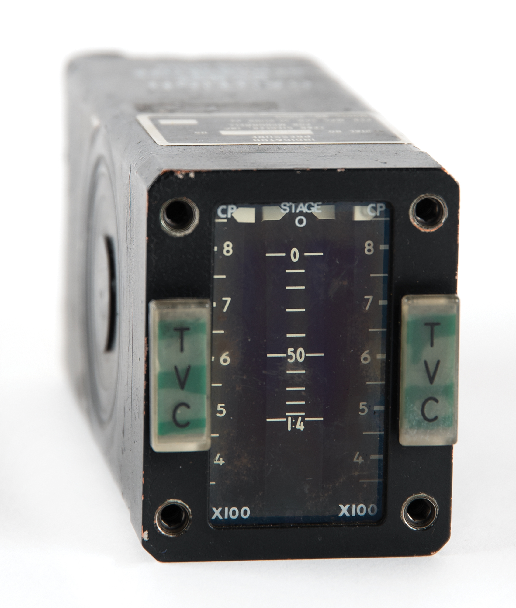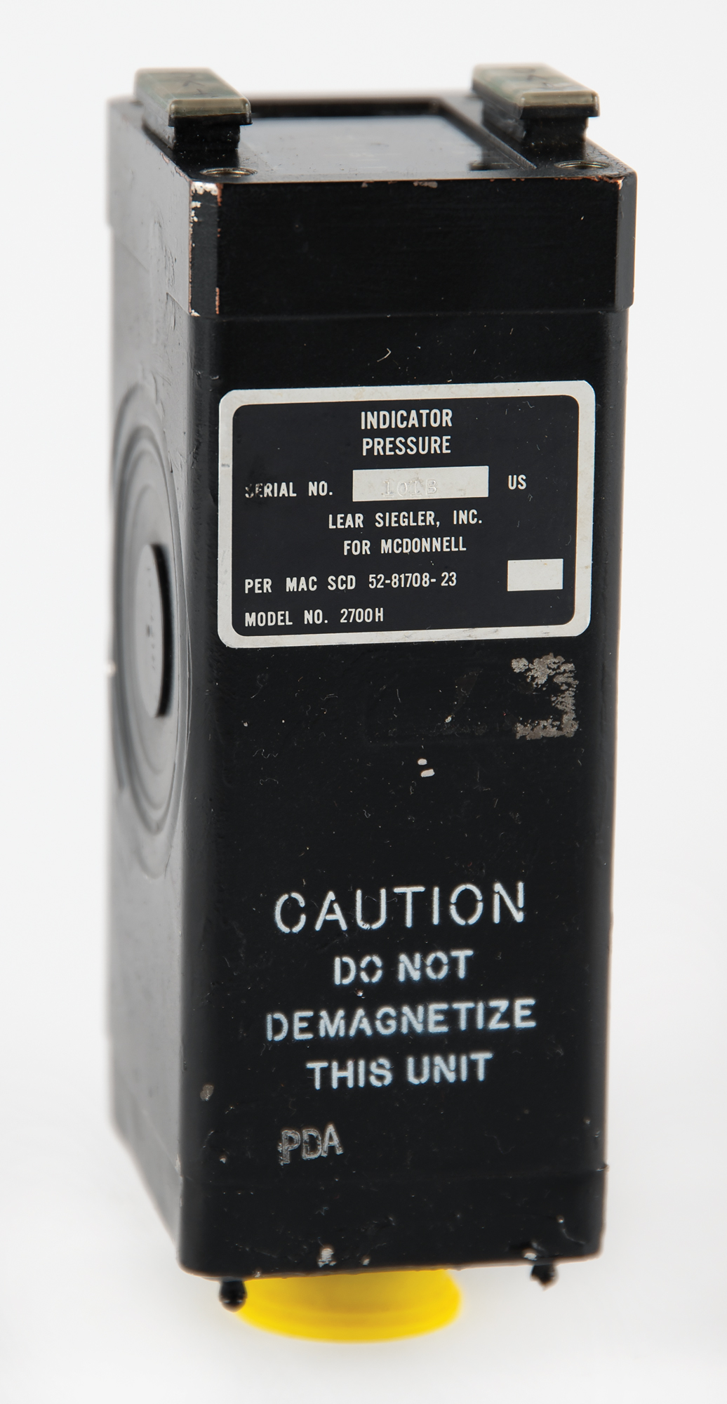 Thrust vector control pressure indicator built for the Gemini spacecraft, measuring 2˝ x 2.5˝ x 6˝, with the manufacturer's tag on top: "Indicator, Pressure, Serial No. 101B US, Lear Siegler, Inc. for McDonnell, Per MAC SCD 52-81708-23, Model No. 2700H." The front panel features dual meters monitoring "Stage 0 CP" with lighted "TVC" indicators. The port on the rear is labeled "J1." In fine condition.