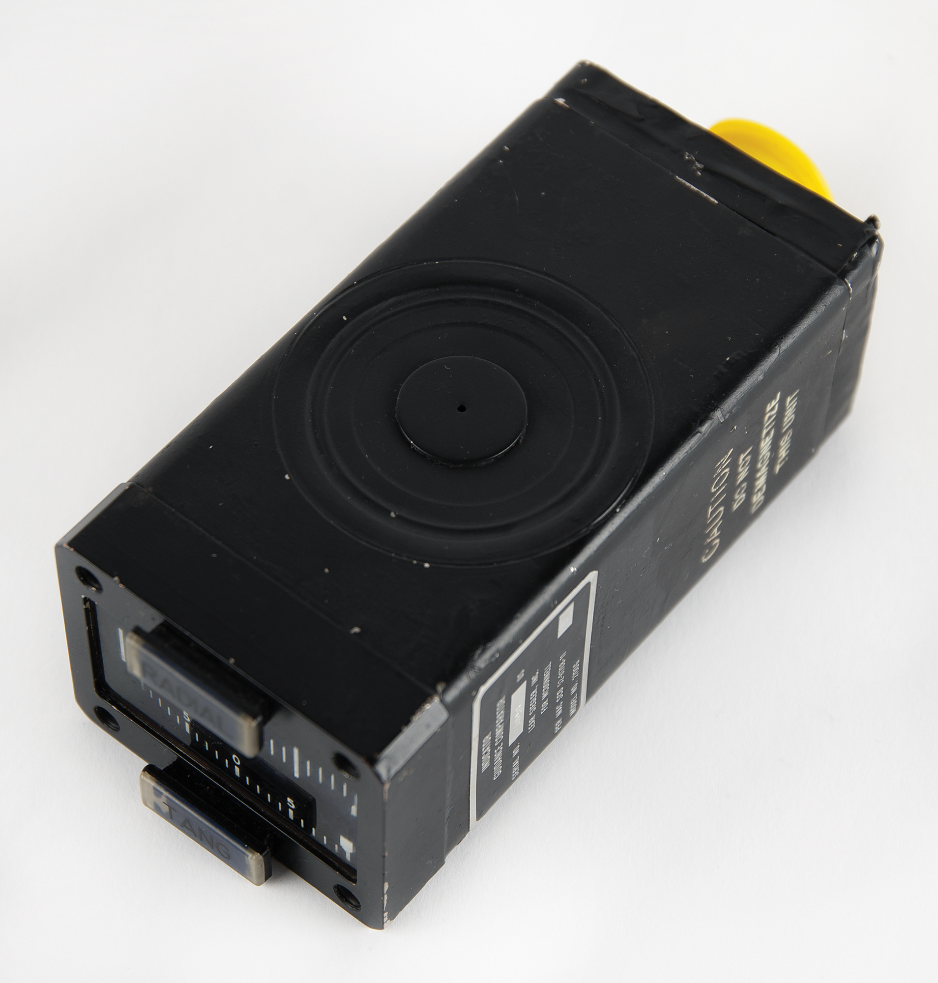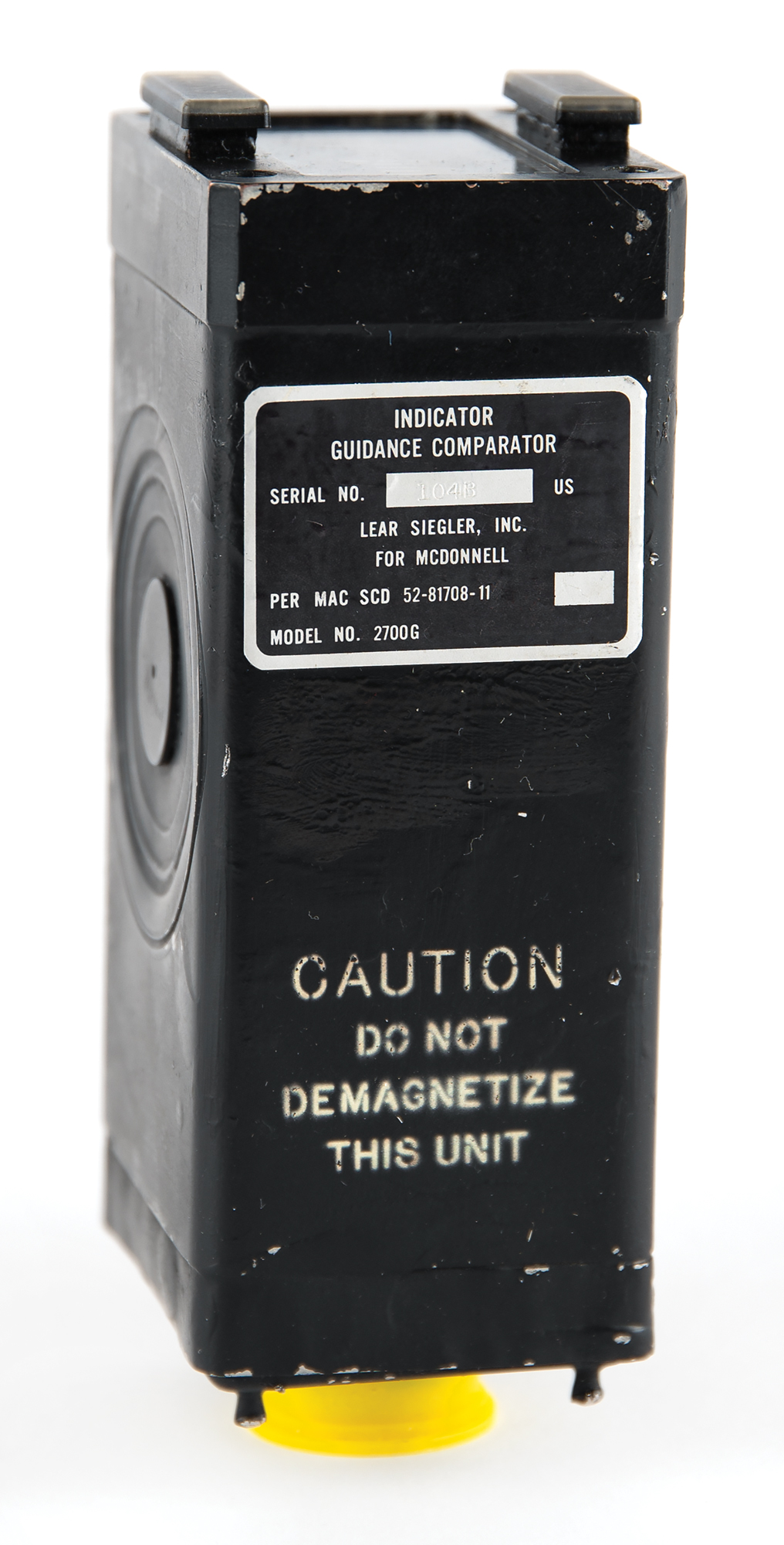 Guidance comparator indicator indicator built for the Gemini spacecraft, measuring 2˝ x 2.5˝ x 6˝, with the manufacturer's tag on top: "Indicator, Guidance Comparator, Serial No. 104B US, Lear Siegler, Inc. for McDonnell, Per MAC SCD 52-81708-11, Model No. 2700G." The front indicator panel features dual meters, with lights labeled "TANG" and "RADIAL." In fine condition.