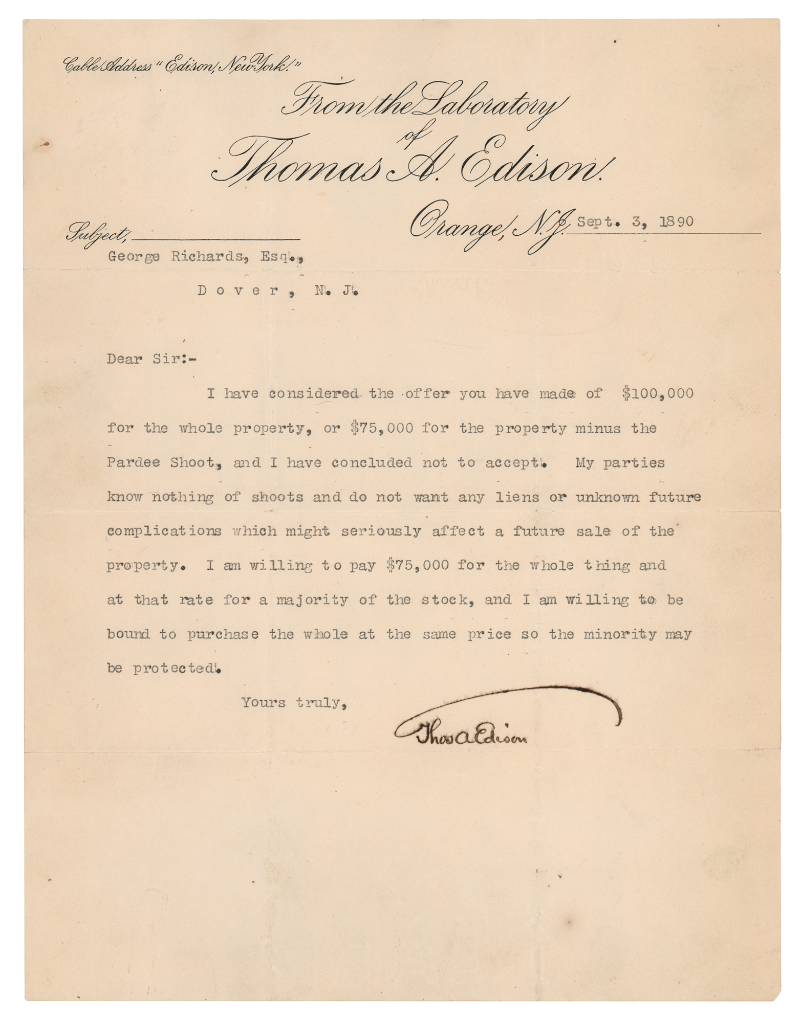 TLS signed “Thos. A. Edison,” one page, 8.25 x 10.75, From the Laboratory of Thomas A. Edison letterhead, September 3, 1890. Letter to George Richards, declining to engage in a real estate deal. In full: "I have considered the offer you have made of $100,000 for the whole property, or $75,000 for the property minus the Pardee Shoot, and I have concluded not to accept. My parties know nothing of shoots and do not want any liens or unknown future complications which might seriously affect a future sale of the property. I am willing to pay $75,000 for the whole thing and at that rate for a majority of the stock, and I am willing to be bound to purchase the whole at the same price so the minority may be protected." In fine condition, with short splits to the fold ends. An interesting piece of correspondence from the notoriously frugal inventor.