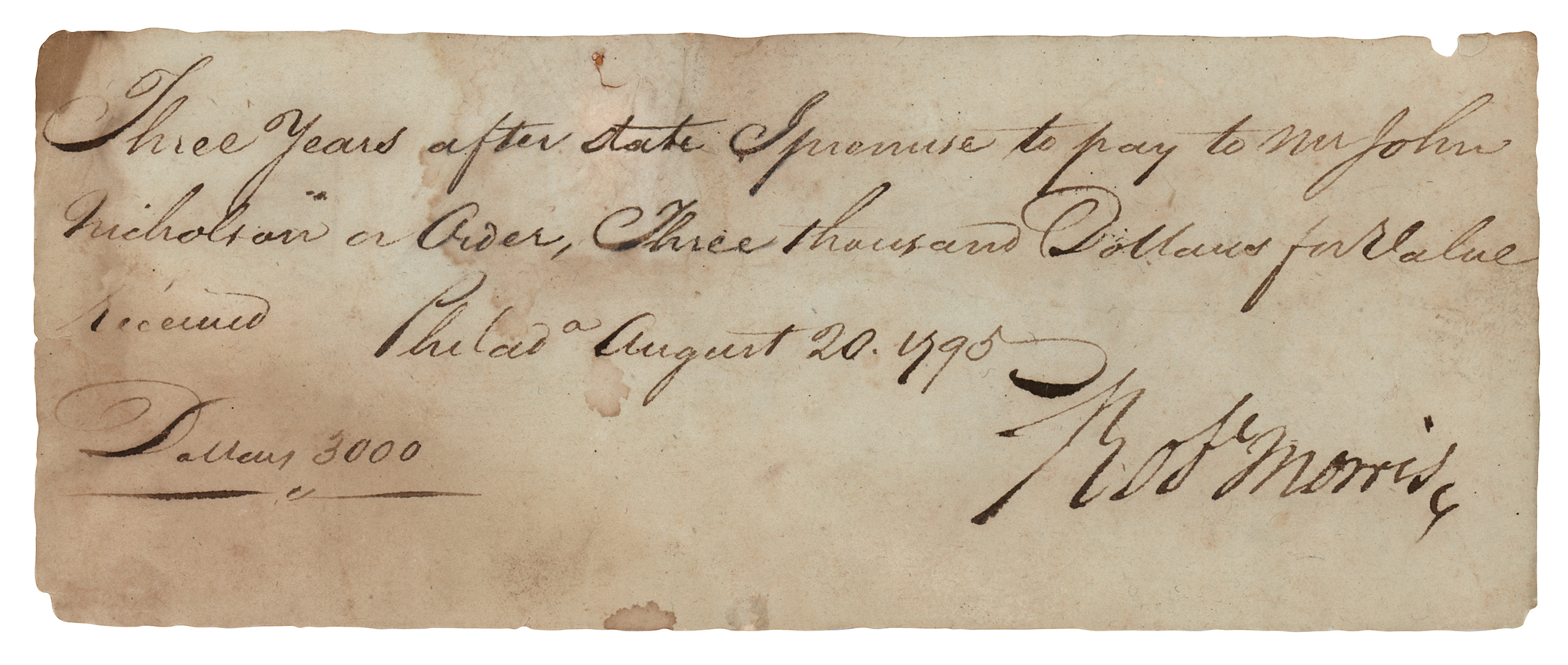 Important financier (1734-1806) who signed the Declaration of Independence, Articles of Confederation, and Constitution. Manuscript DS, signed “Rob't Morris,” one page, 7.75 x 3, August 20, 1795. Promissory note signed by the 'Financier of the American Revolution,' in part: "Three years after date I promise to pay to Mr. John Nicholson or Order, Three thousand Dollars for value received." Boldly signed at the conclusion by Morris, and endorsed on the reverse by Nicholson. In very good condition, with staining, toning, and some minor edge chipping. Accompanied by an engraved portrait.