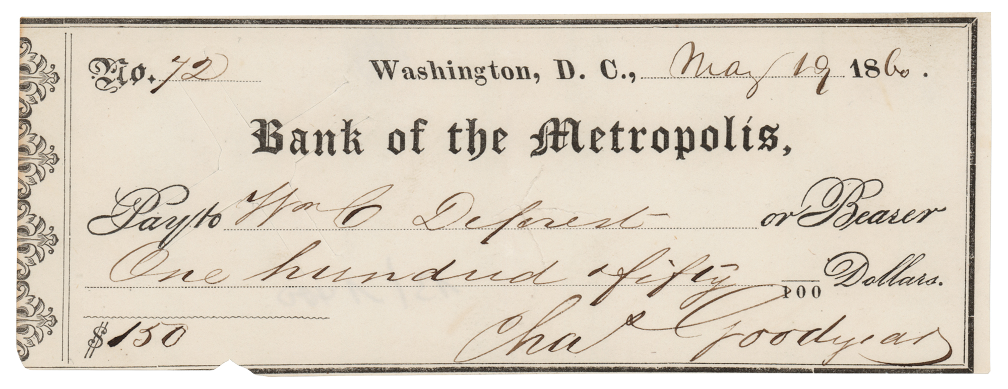 American inventor (1800–1860) whose development of the vulcanization process revolutionized the rubber industry. Bank of the Metropolis check, 6.25 x 2.25, filled out and signed by Goodyear, "Cha's Goodyear," payable to Wm. C. Deforest for $150, May 19, 1860. In fine condition.
