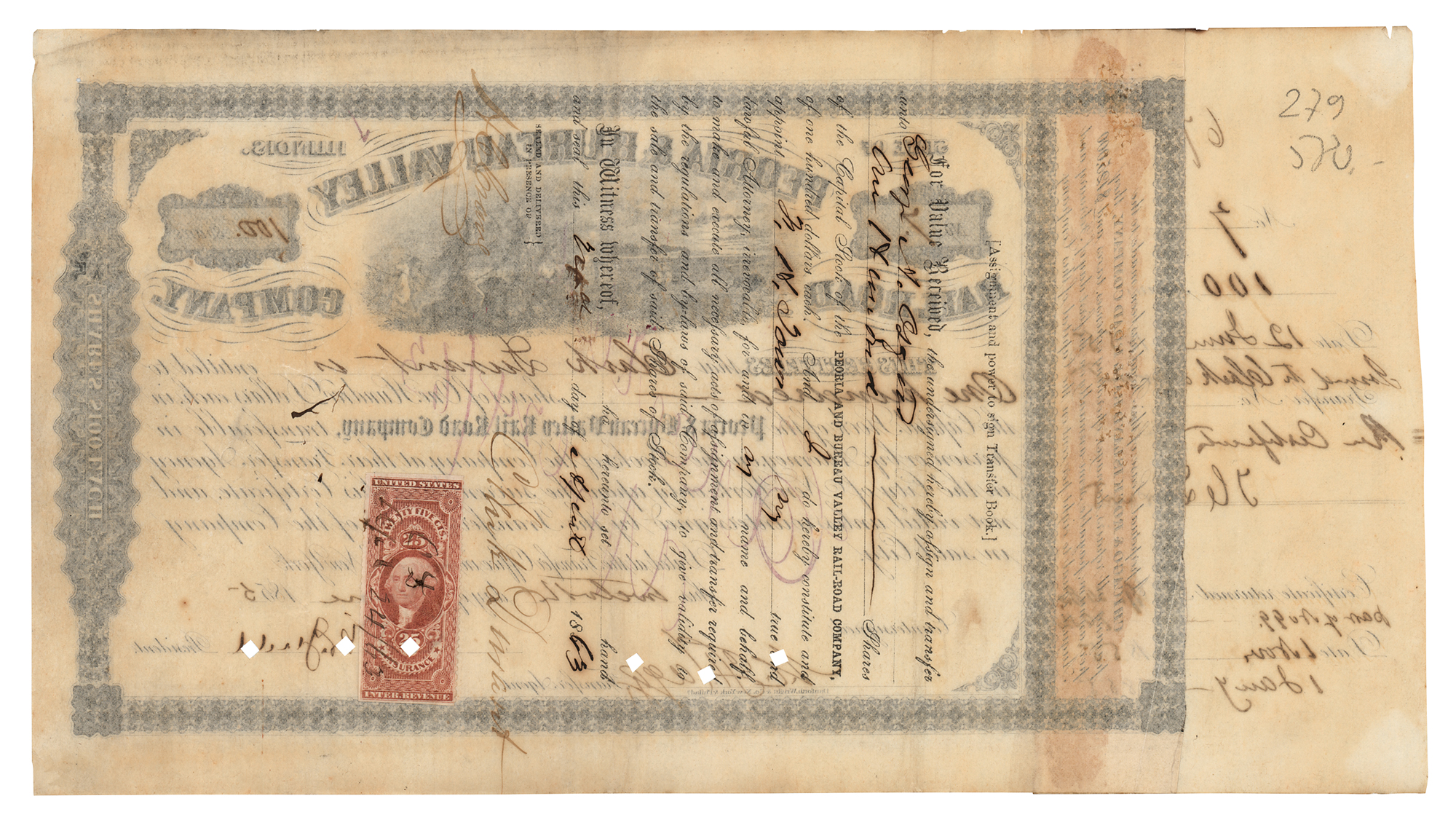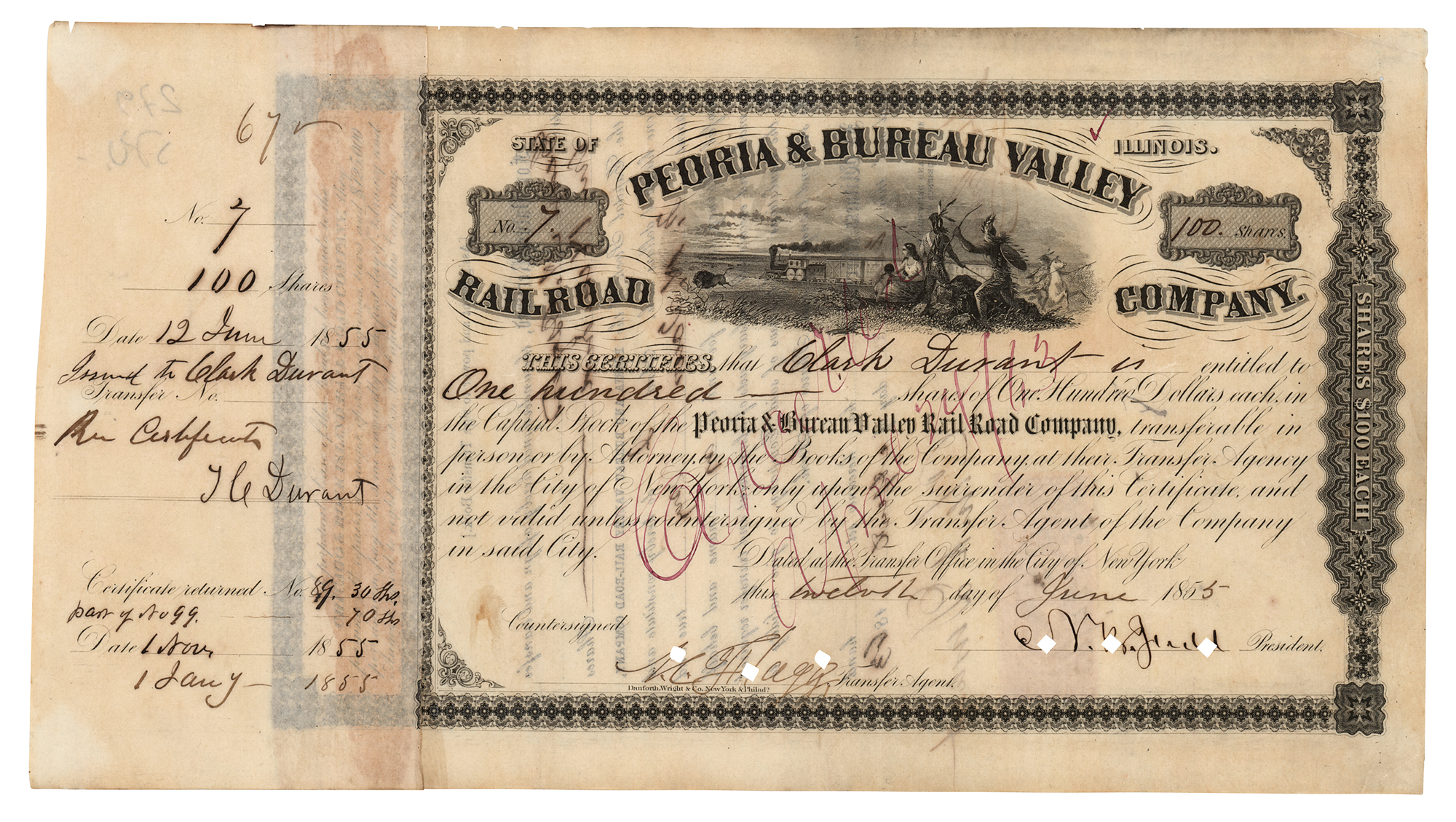 American physician, businessman, and financier (1820–1885) who was vice-president of the Union Pacific Railroad and created the financial structure that led to the Crédit Mobilier scandal. Partly-printed DS, signed “T. C. Durant,” one page, 9.75 x 6.5, June 12, 1855. Stock certificate for 100 shares in the Peoria & Bureau Valley Railroad Company issued to Clark Durant, signed on the affixed receipt by Thomas Clark Durant. In fine condition.
