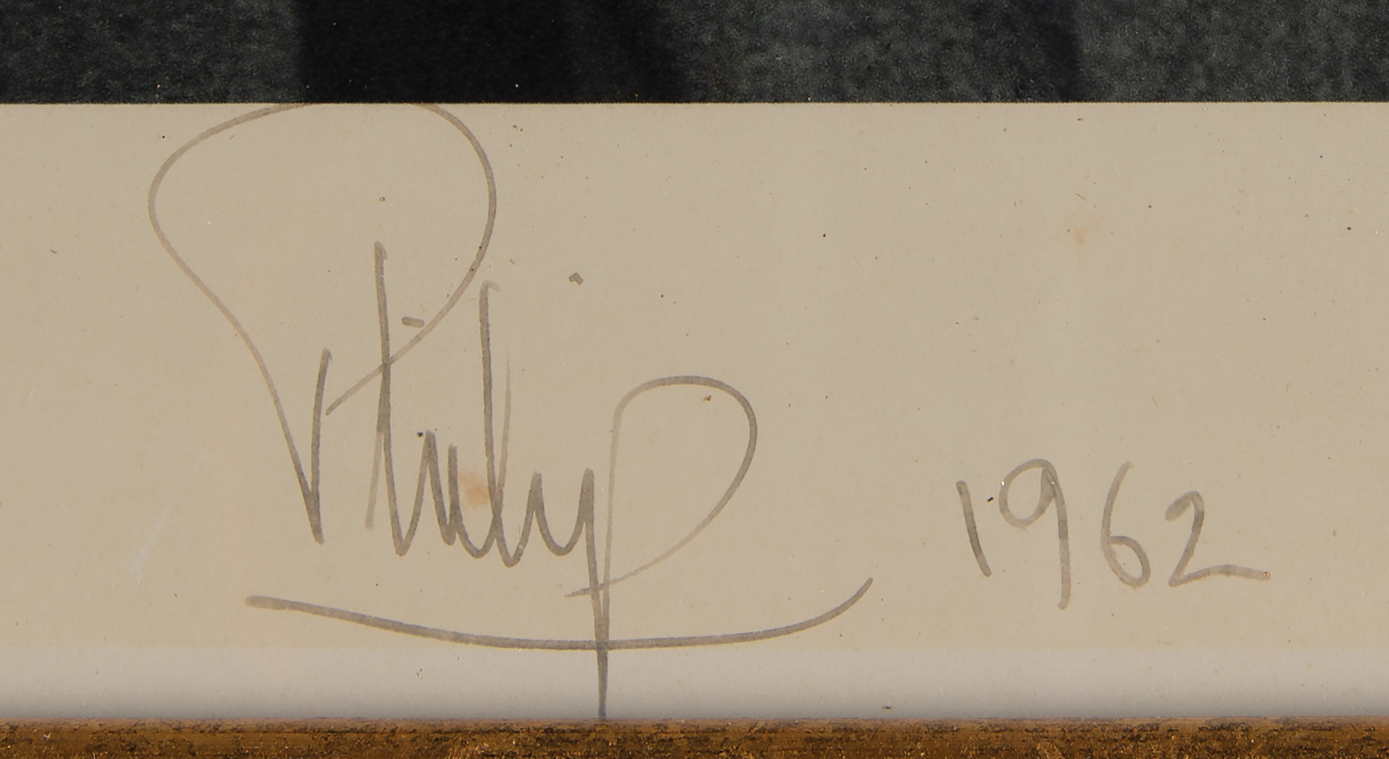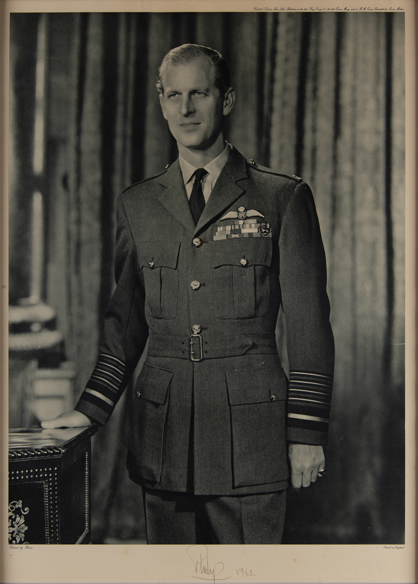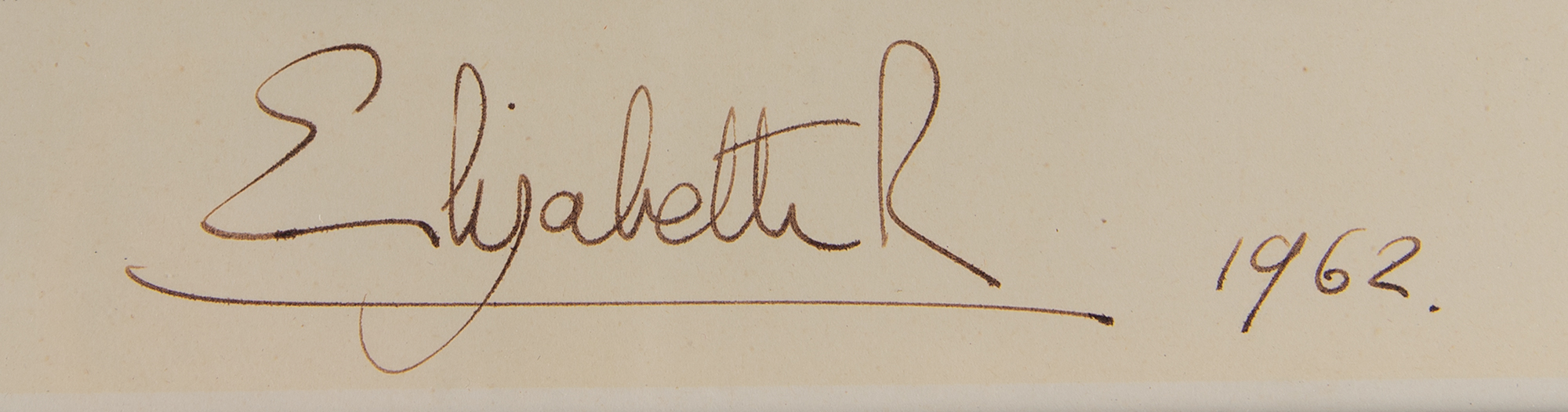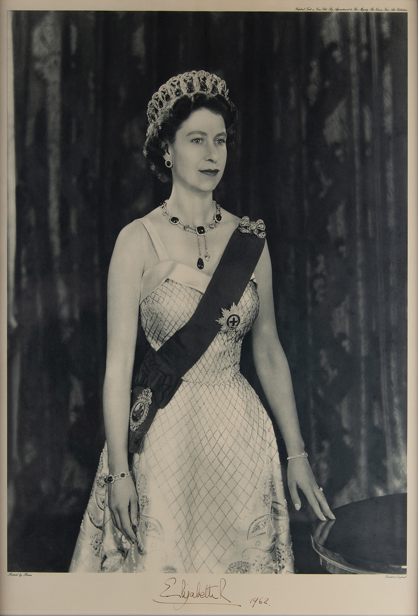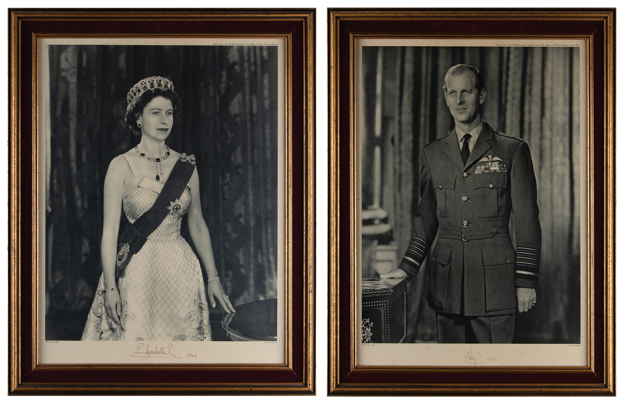 Marvelous pair of vintage oversized 17 x 22.25 portrait photographs of Queen Elizabeth II and Prince Philip, originally taken by Baron Studios (Sterling Henry Nahum) and subsequently published in England by Raphael Tuck & Sons, both individually signed in the lower border in fountain pen, “Elizabeth R., 1962” and “Philip, 1962.” The photographs depict the queen wearing a lovely gown with the Riband and Star of the Order of the Garter, a brooch on the shoulder, and a Lesser George at the waist, and the prince in a handsome three-quarter-length pose in his military uniform. Both are elaborately and individually framed to an overall size of 21 x 26.5, the reverse of each frame backing bearing an affixed label from the “Office of The High Commissioner for Canada,” issuing the portraits to “The Officer’s Mess, Royal Canadian Air Force, St. Hubert, Quebec.” In overall fine condition.