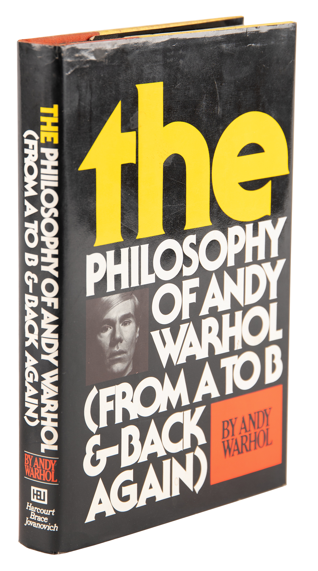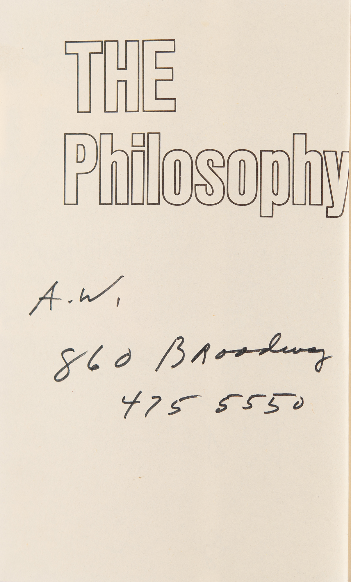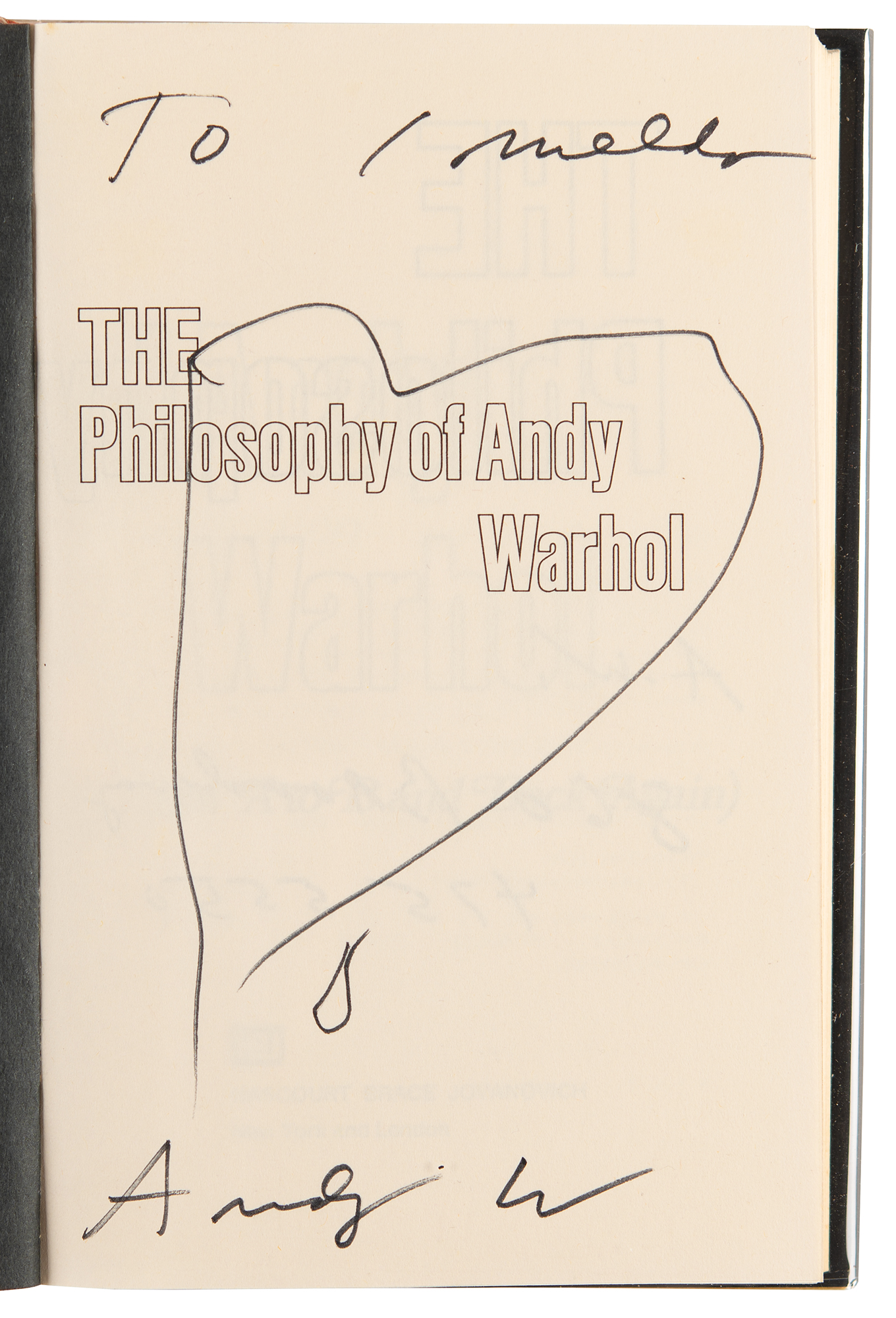 Signed book: The Philosophy of Andy Warhol (From A to B & Back Again). First edition. NY: Harcourt Brace Jovanovich, 1975. Hardcover with dust jacket, 5.75 x 8.5, 241 pages. Signed and inscribed on the half-title page in black felt tip, "To Imelda, Andy W.," drawing a full-page sketch of a heart; on the opposite side of the page, Warhol writes his initials, address, and phone number: "A. W., 860 Broadway, 475-5550." In fine to very fine condition, with foxing to the top edge of the textblock. Consignor notes that the recipient was Imelda Marcos, the first lady of the Philippines, one of Warhol's friends and associates. The 860 Broadway address was home to Warhol's third 'Factory,' which occupied an entire floor of the six-story building from 1974 until 1984. A fantastic association piece signed by the iconic pop artist.