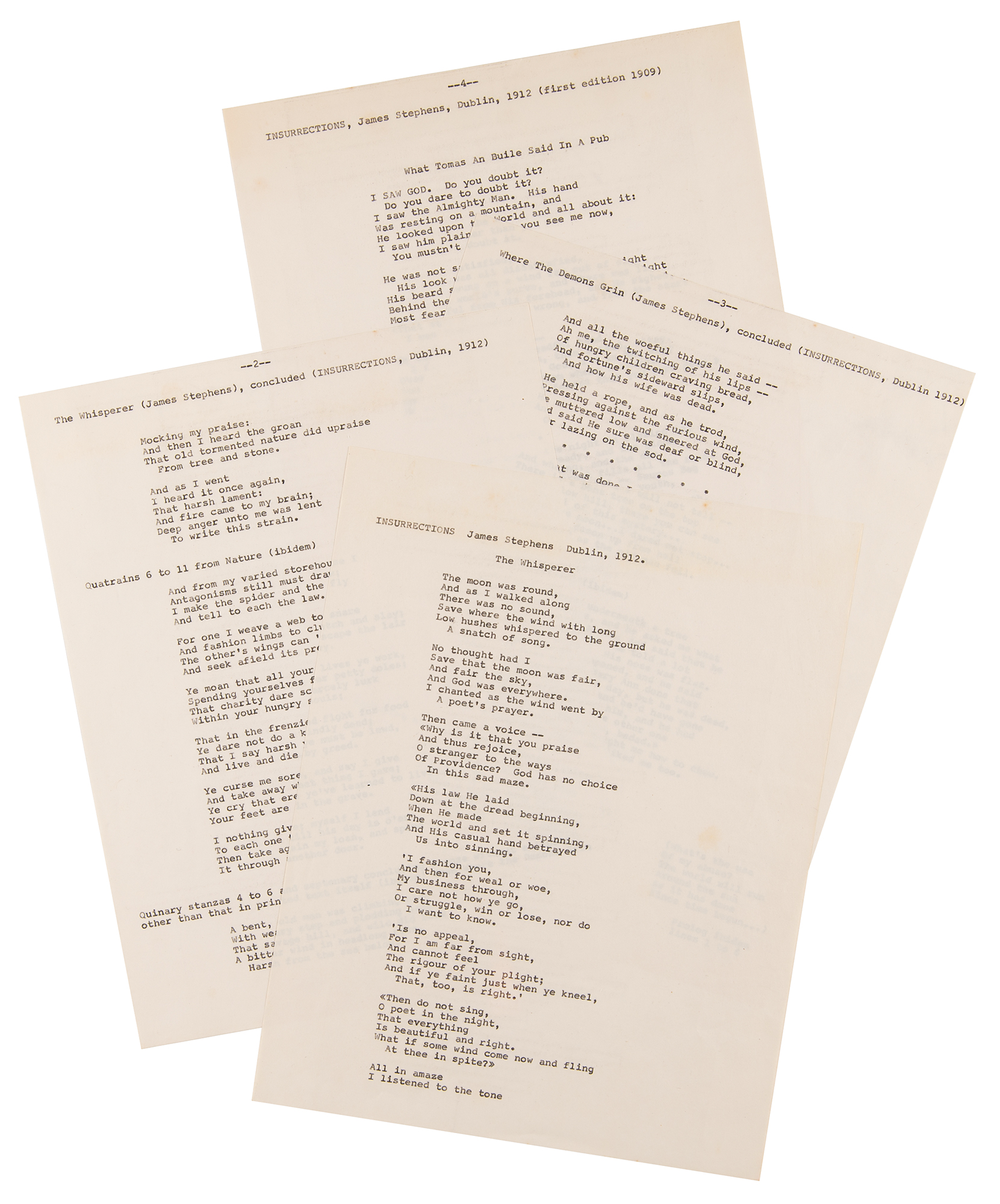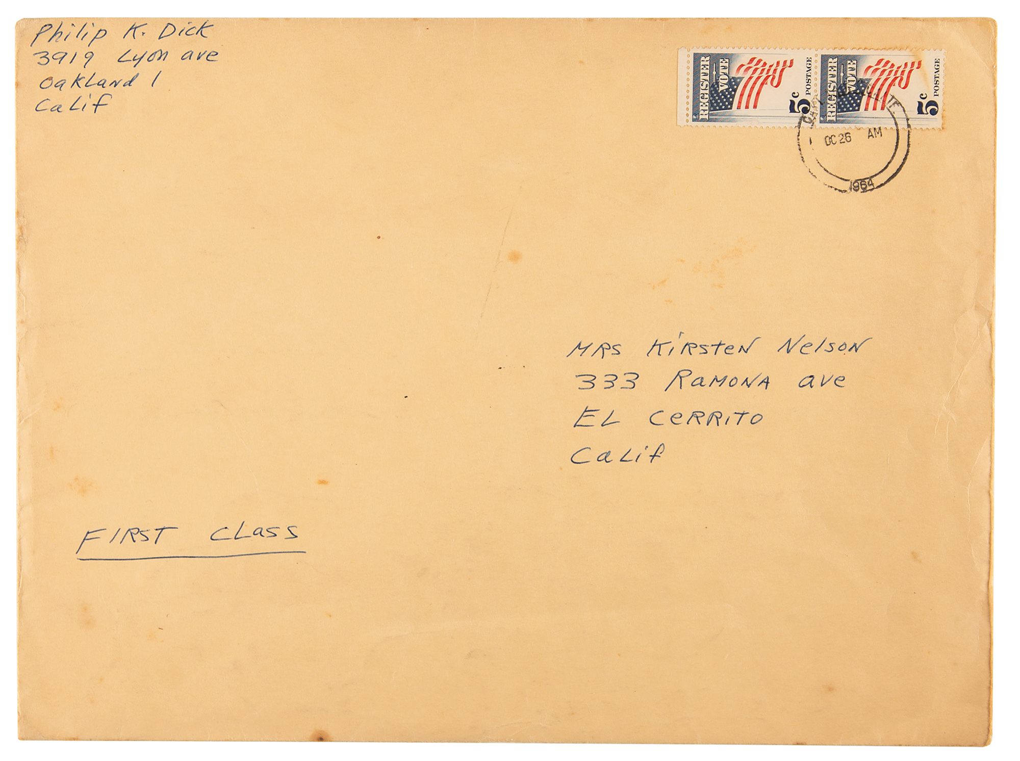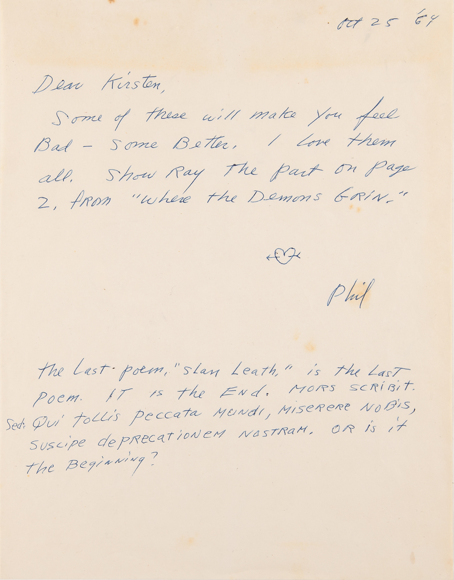 ALS signed “Phil,” who adds a heart with arrow sketch, one page, 8.5 x 11, October 25, 1964. Handwritten letter to Kirsten Nelson, the wife of science fiction author Ray Nelson, who had known Dick since childhood and purportedly introduced the writer to LSD. It’s believed that Dick was secretly in love with Kirsten, and, unable to openly express his true feelings, he chose to immortalize her as a character in many of his books. He also, as this letter shows, sent her poetry. It reads as follows: “Some of these will make you feel bad—some better. I love them all. Show Ray the part on page 2, from ‘Where the Demons Grin.’” Below, Dick adds: “The Last poem, ‘Slan Leath,’ is the last poem. It is the end. Mors Scribit. Sedi Qui tollis peccata mundi, miserere nobis, suscipe deprecationem nostram. Or is it the beginning?” Included with the letter are four pages of typed poems and partial poems by Irish poet James Stephens from his poetry collection Insurrections, which includes ‘The Whisperer,’ ‘Nature,’ ‘Where the Demons Grin,’ ‘Seumas Beg,’ ‘The Rebel,’ ‘What Tomas An Buile Said In A Pub,’ and ‘Slan Leath.’ In fine condition, with scattered faint stains. Accompanied by the original mailing envelope hand-addressed by Dick, who incorporates his signature into the return address field: “Philip K. Dick, 3919 Lyon Ave, Oakland 1, Calif.”