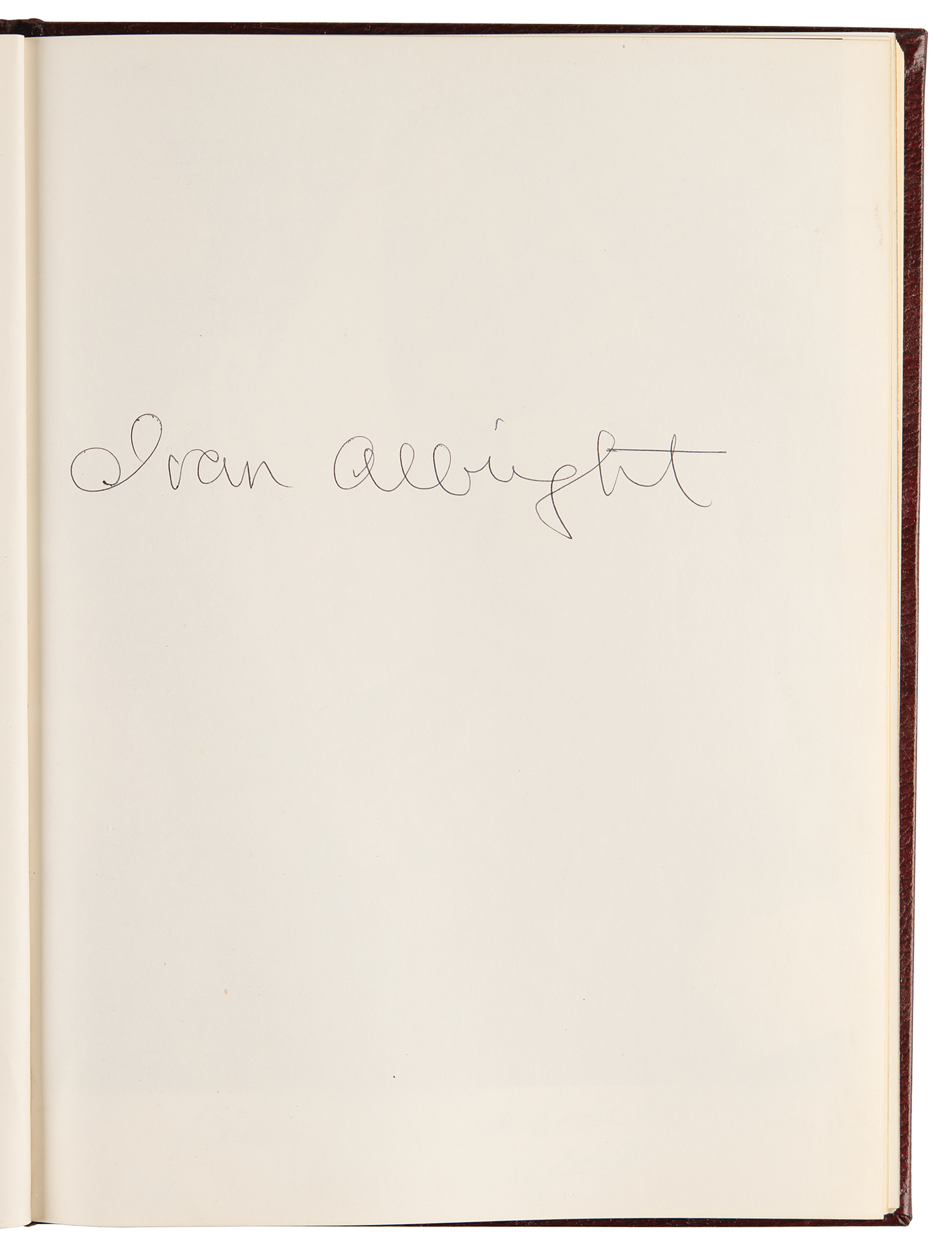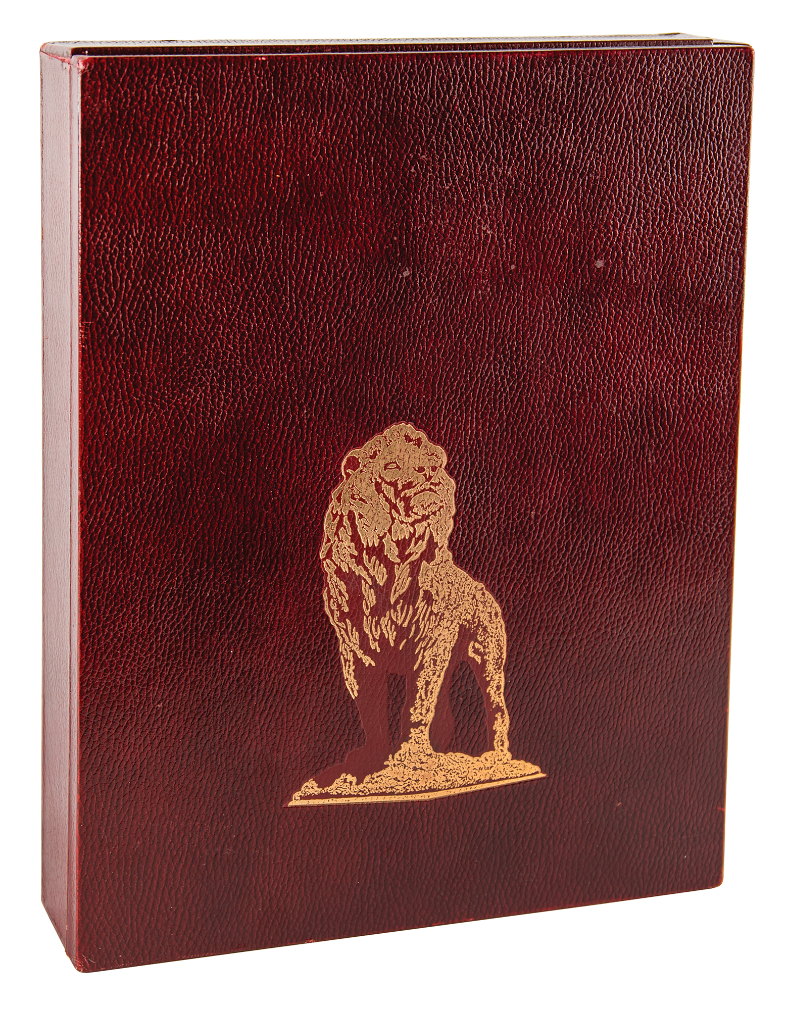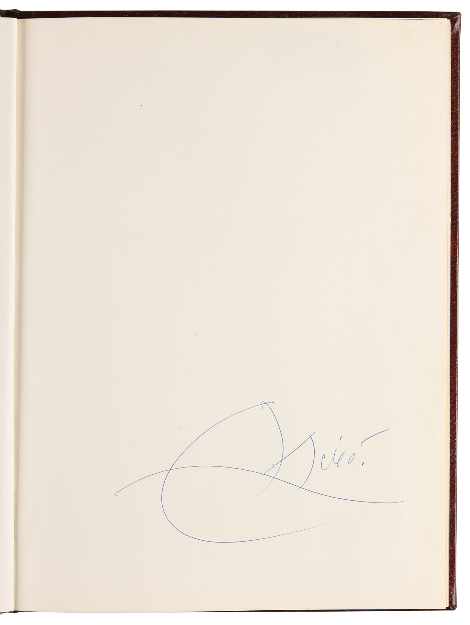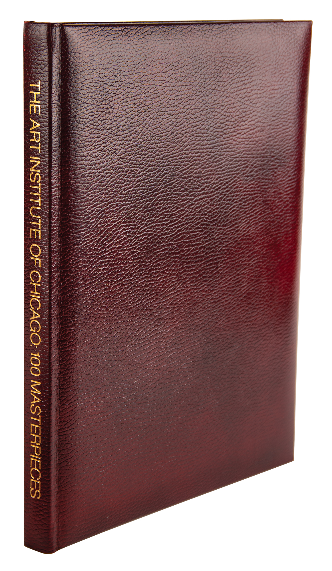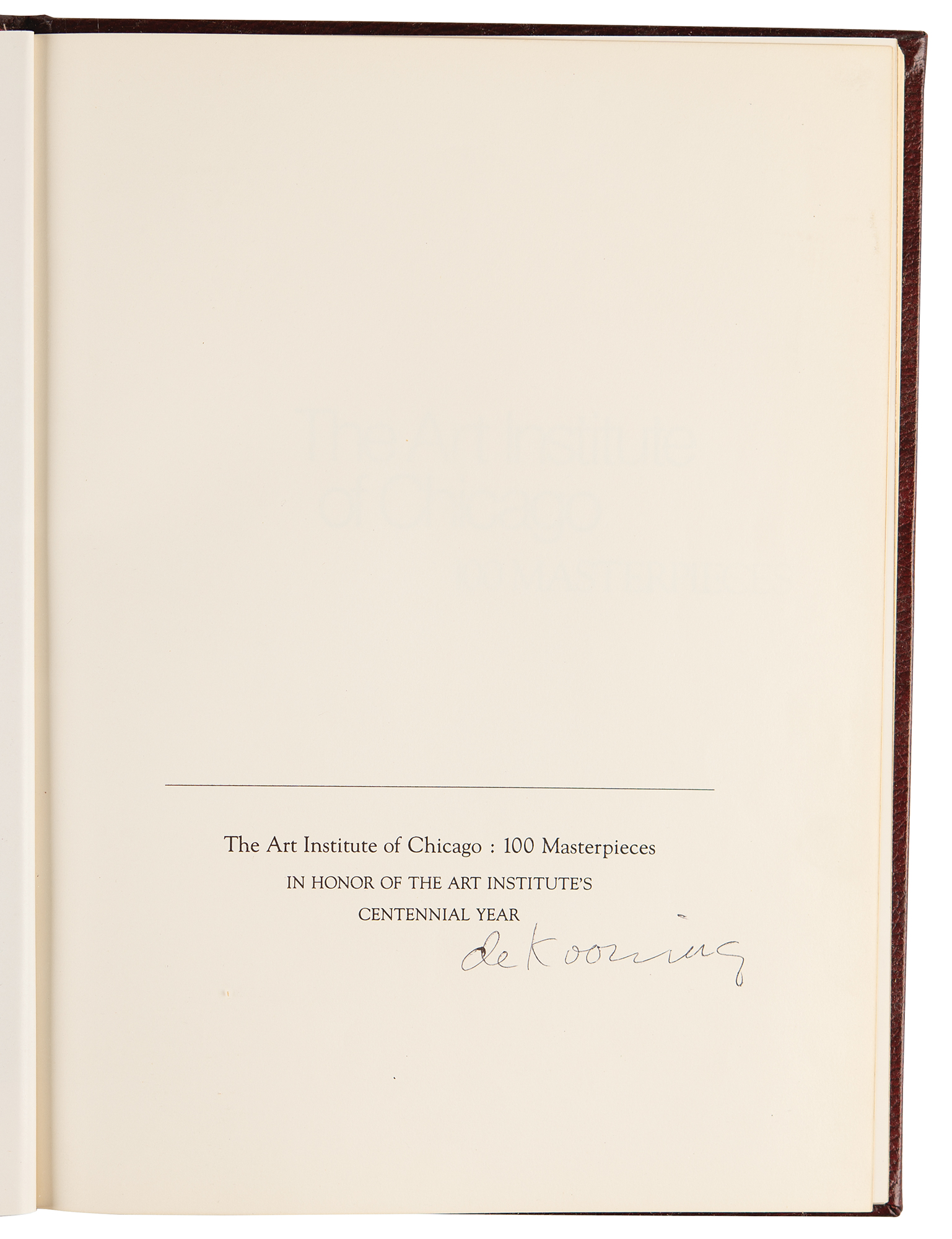 Exquisite multi-signed book: The Art Institute of Chicago: 100 Masterpieces. First edition, first printing. Chicago, Illinois: Rand McNally & Company / Printed and bound by R. R. Donnelley & Sons and Lakeside Press, 1978. Bound in fine dark red Morocco leather with gilt titling to the spine, and accompanied by its matching red leather clamshell presentation box with a large gold lion on the front lid, 12 x 15.5, 159 pages. Signed inside on separate pages in ballpoint by adored artists Marc Chagall, Joan Miro, Ivan Albright, and Willem de Kooning. In fine to very fine condition, with some wear to the clamshell case. Produced in honor of the 100th birthday of the Art Institute of Chicago in 1979, this large, gorgeous book contains color reproductions of 100 of the most magnificent art treasures that the Art Institute of Chicago holds in trust, including paintings by the artists who signed the book.
