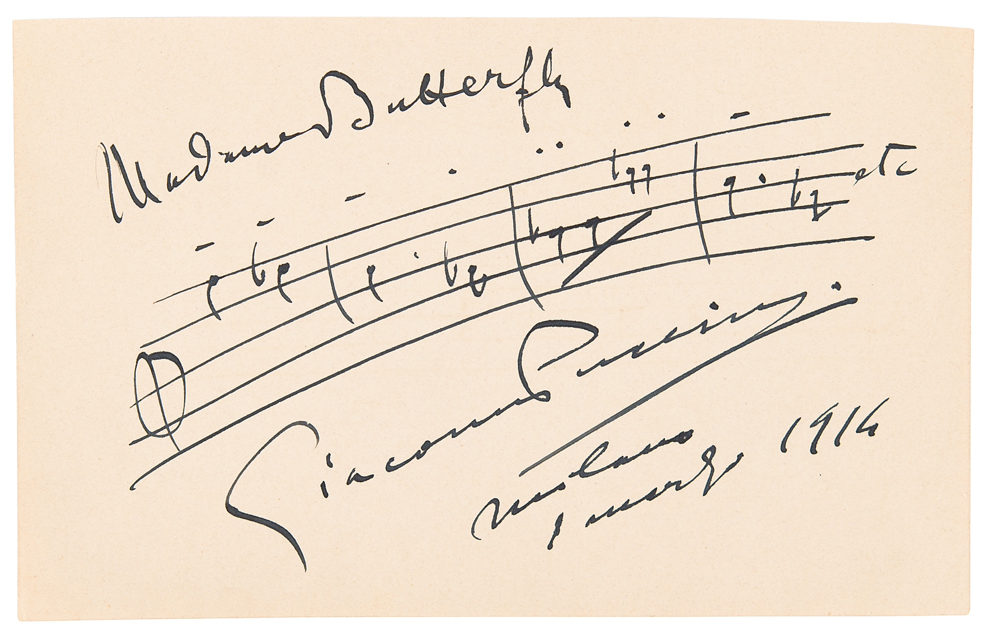 Marvelous AMQS in bold fountain pen on an off-white 7.25 x 4.5 sheet, signed below by the esteemed composer, "Giacomo Puccini, Milano, 1 marz 1914,” who pens four bars of music from his famous “Madame Butterfly.” In very fine condition. A wonderful quote from one of Puccini's most enduring works: today, Madame Butterfly is the sixth most-performed opera in the world.