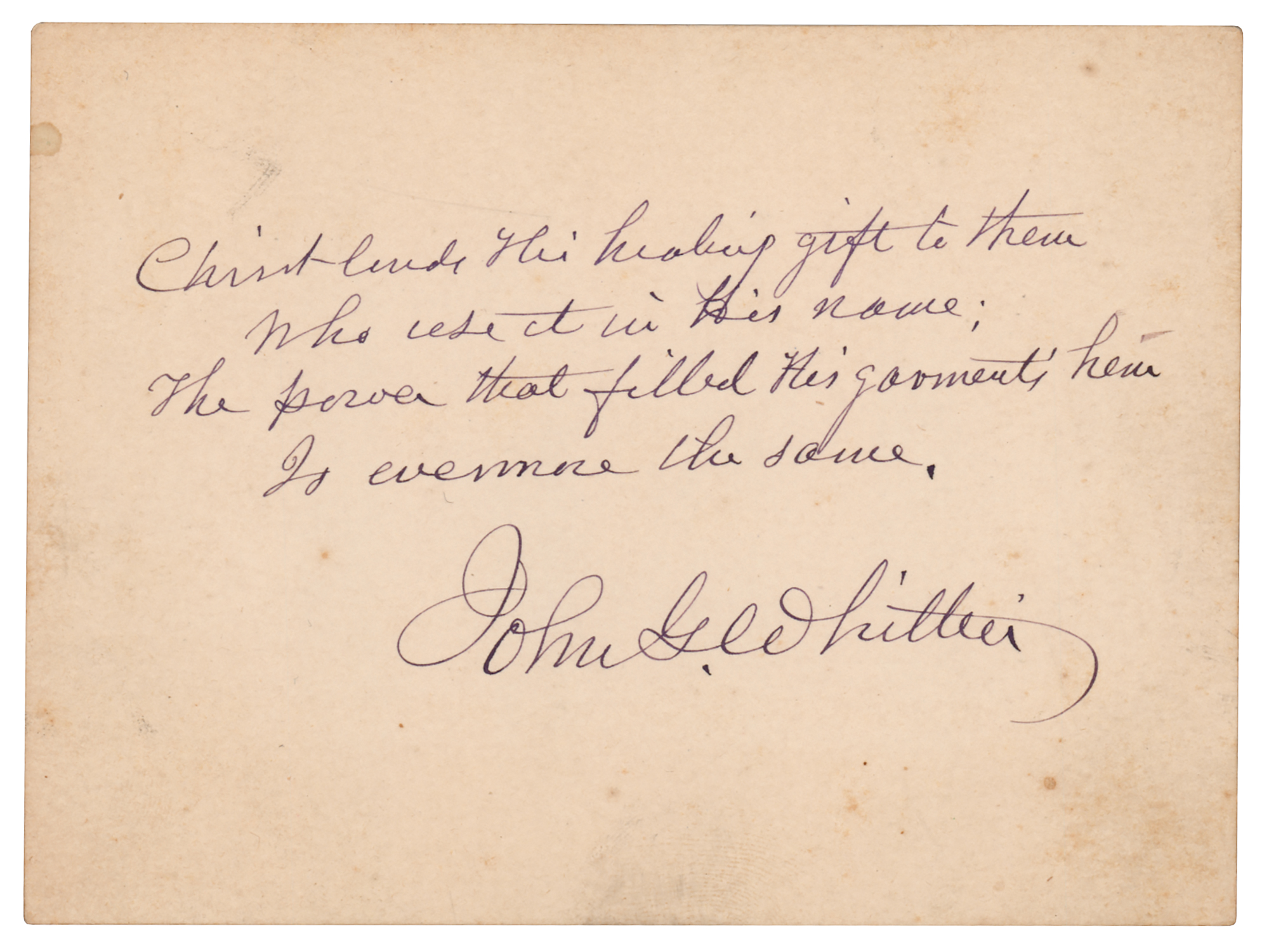 AQS on an off-white 4.5 x 3.5 card, signed below in purple ink, "John G. Whittier." Quoting from his religious poem 'The Healer, Whittier writes: "Christ lends His healing gift to them / Who use it in his name; / The power that filled His garment's hem / Is evermore the same." In fine condition.