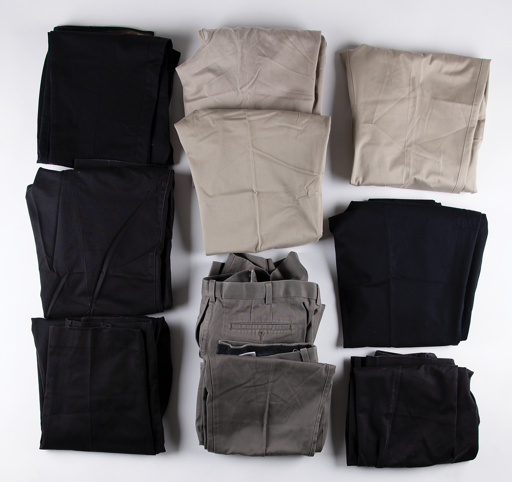 From the estate of Apollo 12 moonwalker Alan Bean—a collection of 10 pairs of pants that Bean wore regularly in his home art studio in Houston, Texas. The collection includes three pairs of light khaki pants, two pairs of brown khaki pants, and five pairs of black/dark blue trousers, all sized 38 x 29 and made by Savane. In overall fine condition, with expected wear from use. Accompanied by a letter of authenticity from Amy Bean, the daughter of Alan Bean.