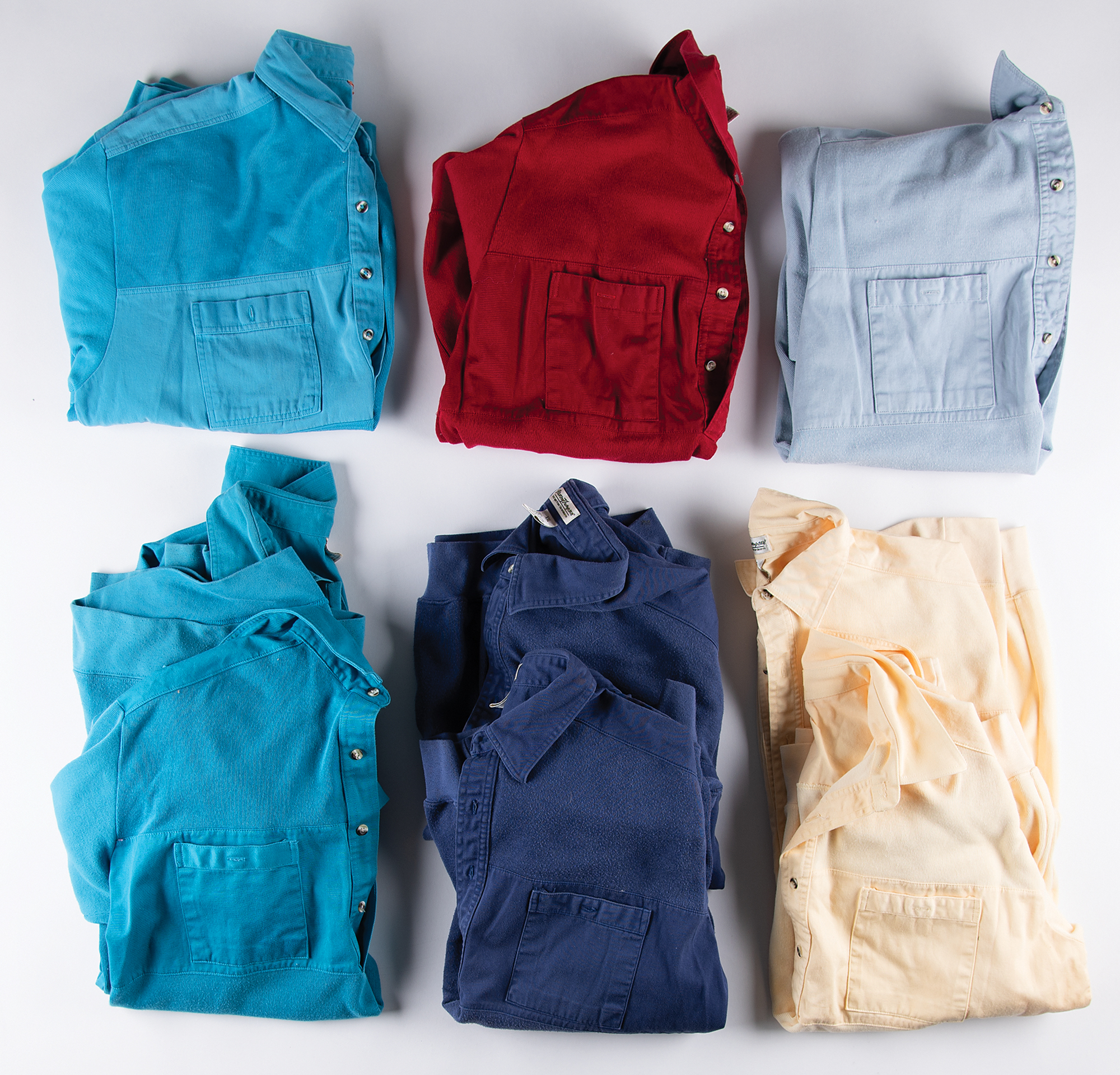 From the estate of Apollo 12 moonwalker Alan Bean—a collection of nine shirts and pullovers by Norm Thompson that Bean wore regularly in his home art studio in Houston, Texas. The collection includes (5) pullover collared shirts (all XXL) and (4) polo-style shirts (all XL). In overall fine condition, with expected wear from use, including a few stains. Accompanied by a letter of authenticity from Amy Bean, the daughter of Alan Bean.