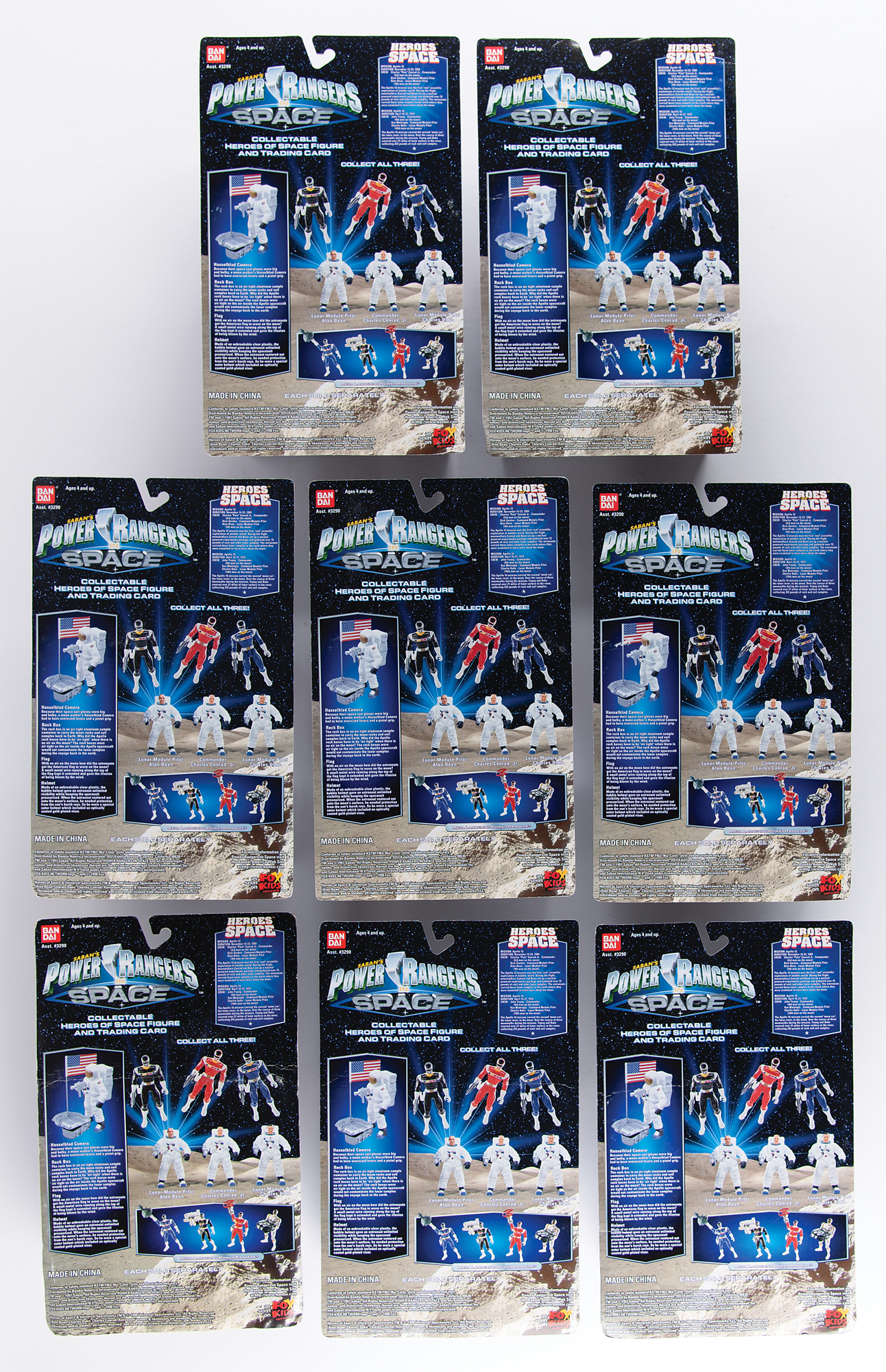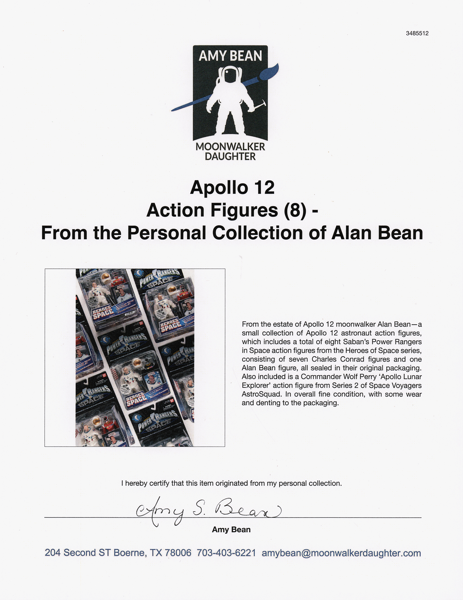From the estate of Apollo 12 moonwalker Alan Bean—a small collection of Apollo 12 astronaut action figures, which includes a total of eight Saban’s Power Rangers in Space action figures from the Heroes of Space series, consisting of seven Charles Conrad figures and one Alan Bean figure, all sealed in their original packaging. Also included is a Commander Wolf Perry ‘Apollo Lunar Explorer’ action figure from Series 2 of Space Voyagers AstroSquad. In overall fine condition, with some wear and denting to the packaging. Accompanied by a letter of authenticity from Amy Bean, the daughter of Alan Bean.