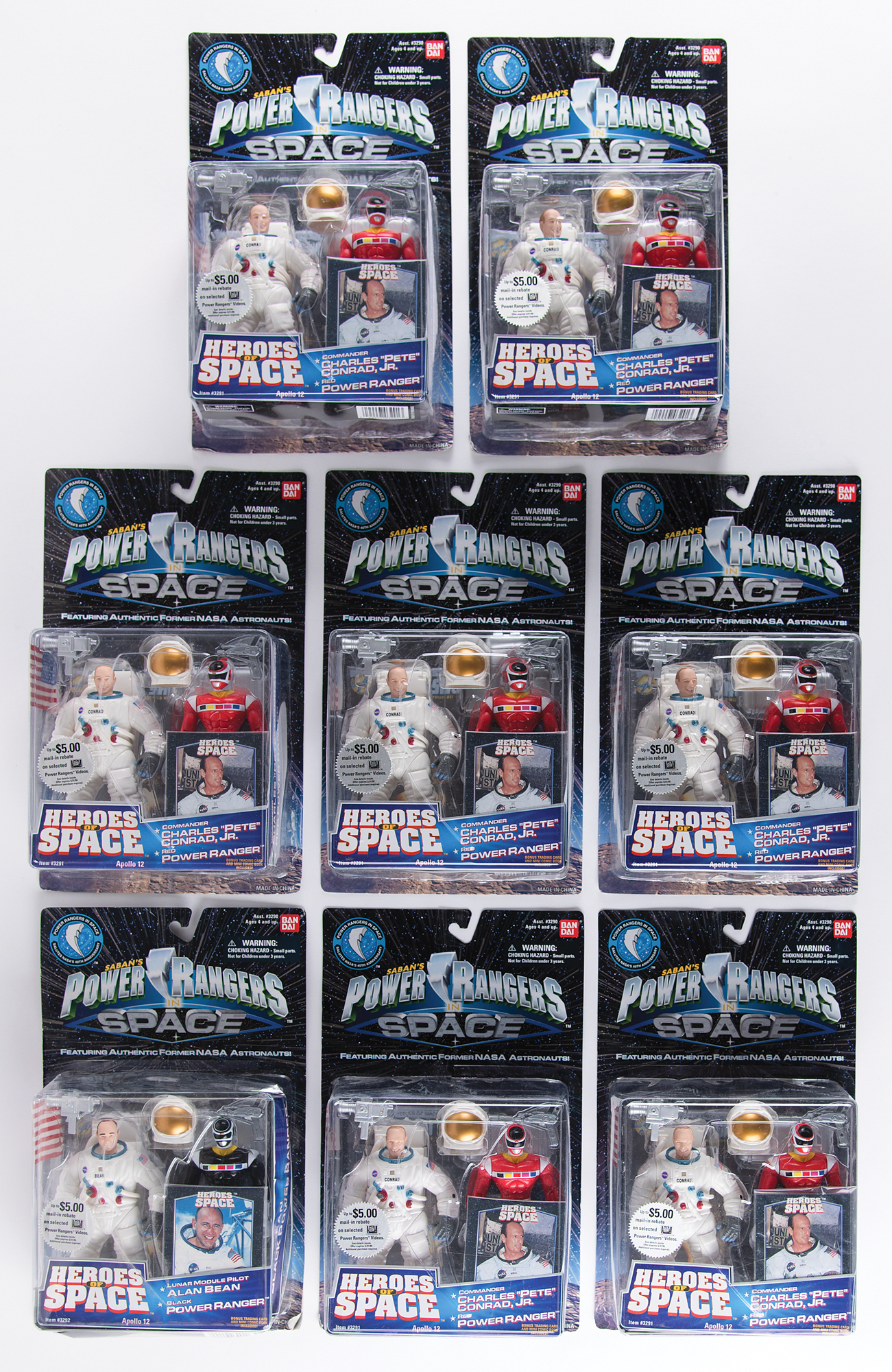 From the estate of Apollo 12 moonwalker Alan Bean—a small collection of Apollo 12 astronaut action figures, which includes a total of eight Saban’s Power Rangers in Space action figures from the Heroes of Space series, consisting of seven Charles Conrad figures and one Alan Bean figure, all sealed in their original packaging. Also included is a Commander Wolf Perry ‘Apollo Lunar Explorer’ action figure from Series 2 of Space Voyagers AstroSquad. In overall fine condition, with some wear and denting to the packaging. Accompanied by a letter of authenticity from Amy Bean, the daughter of Alan Bean.