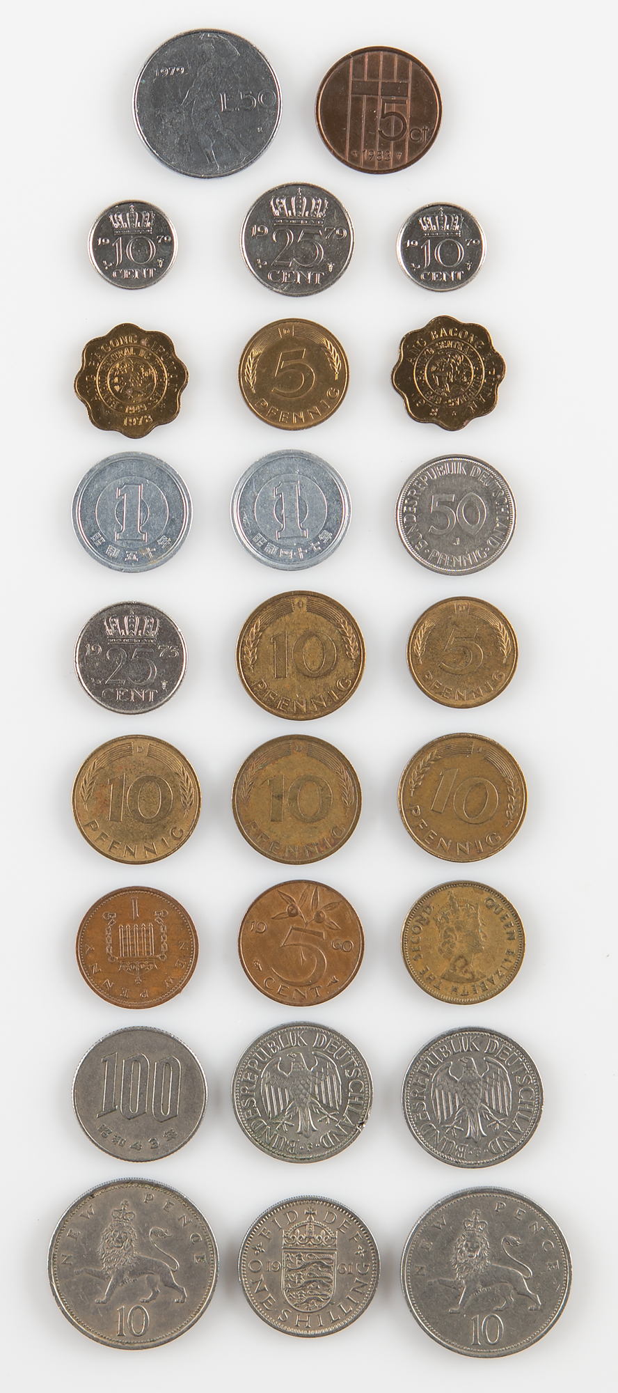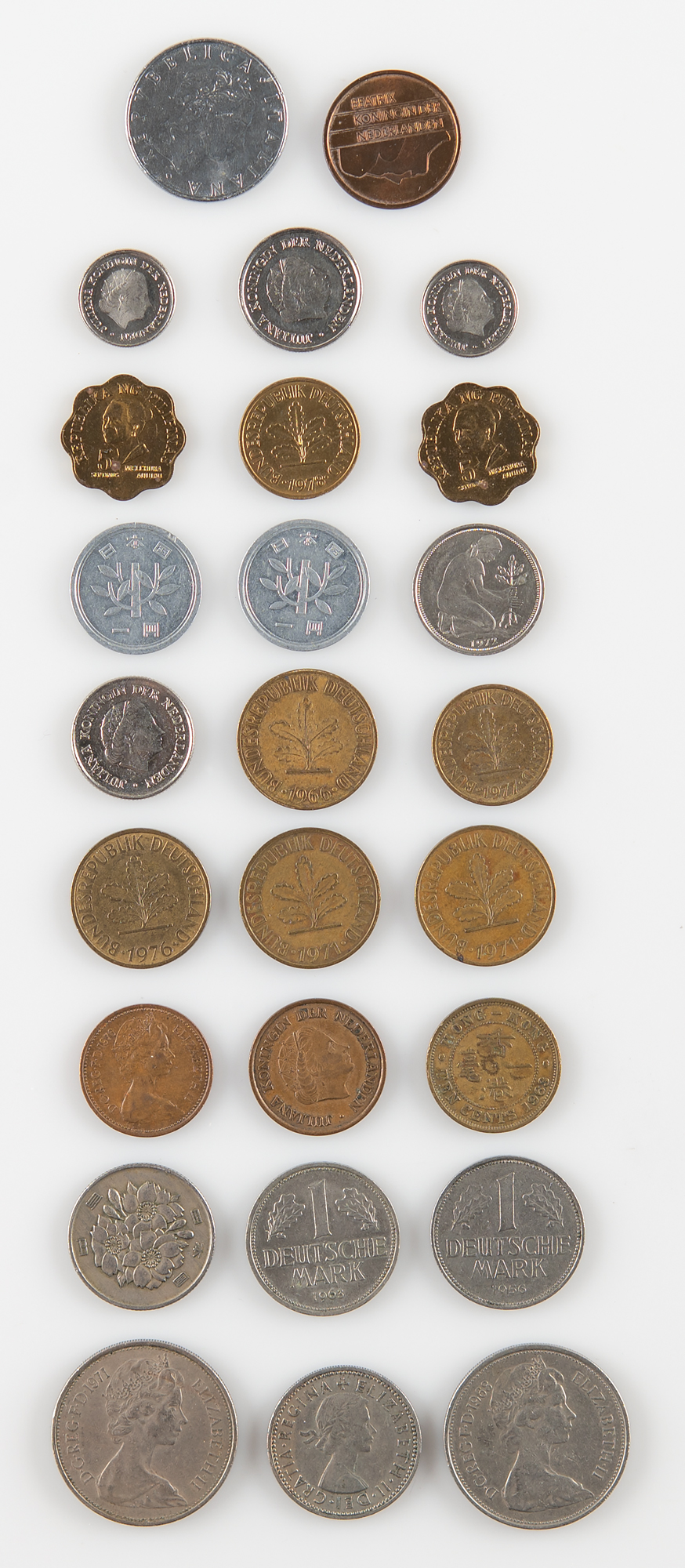 From the estate of Apollo 12 moonwalker Alan Bean—a collection of 26 international coins collected by Bean during his travels from around the world, which includes coins from countries like Italy, the Netherlands, Germany, Hong Kong, the Philippines, and the United Kingdom. In overall fine condition. Accompanied by a letter of authenticity from Amy Bean, the daughter of Alan Bean.