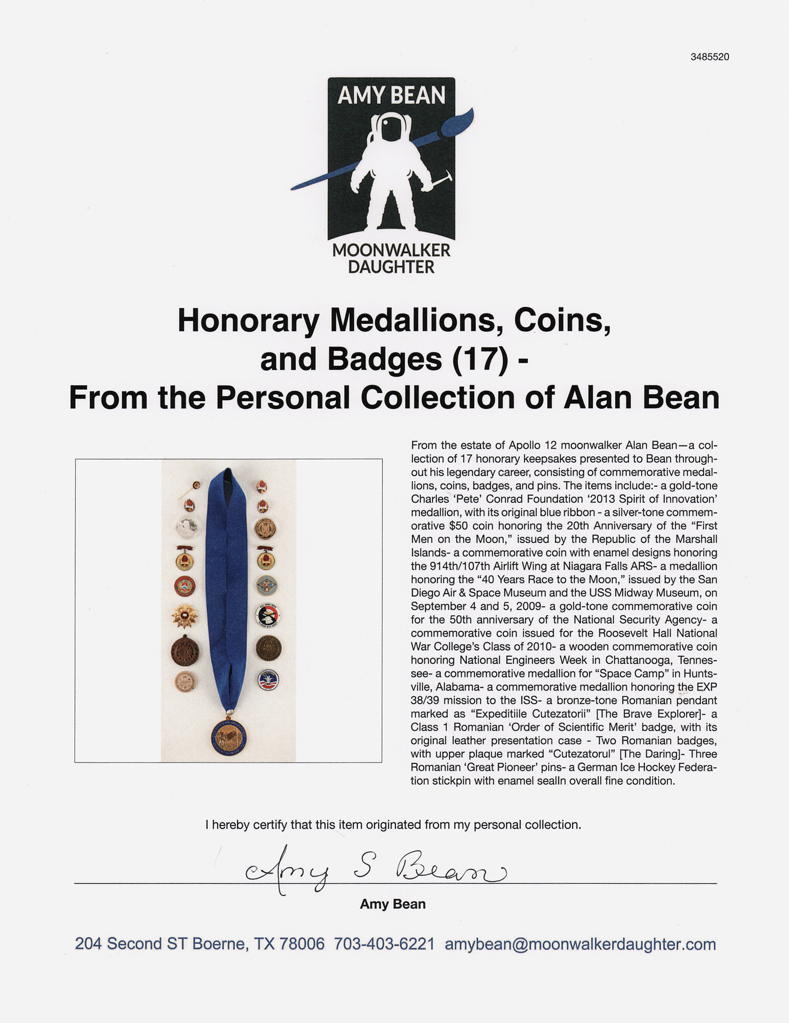 From the estate of Apollo 12 moonwalker Alan Bean—a collection of 17 honorary keepsakes presented to Bean throughout his legendary career, consisting of commemorative medallions, coins, badges, and pins. The items include: