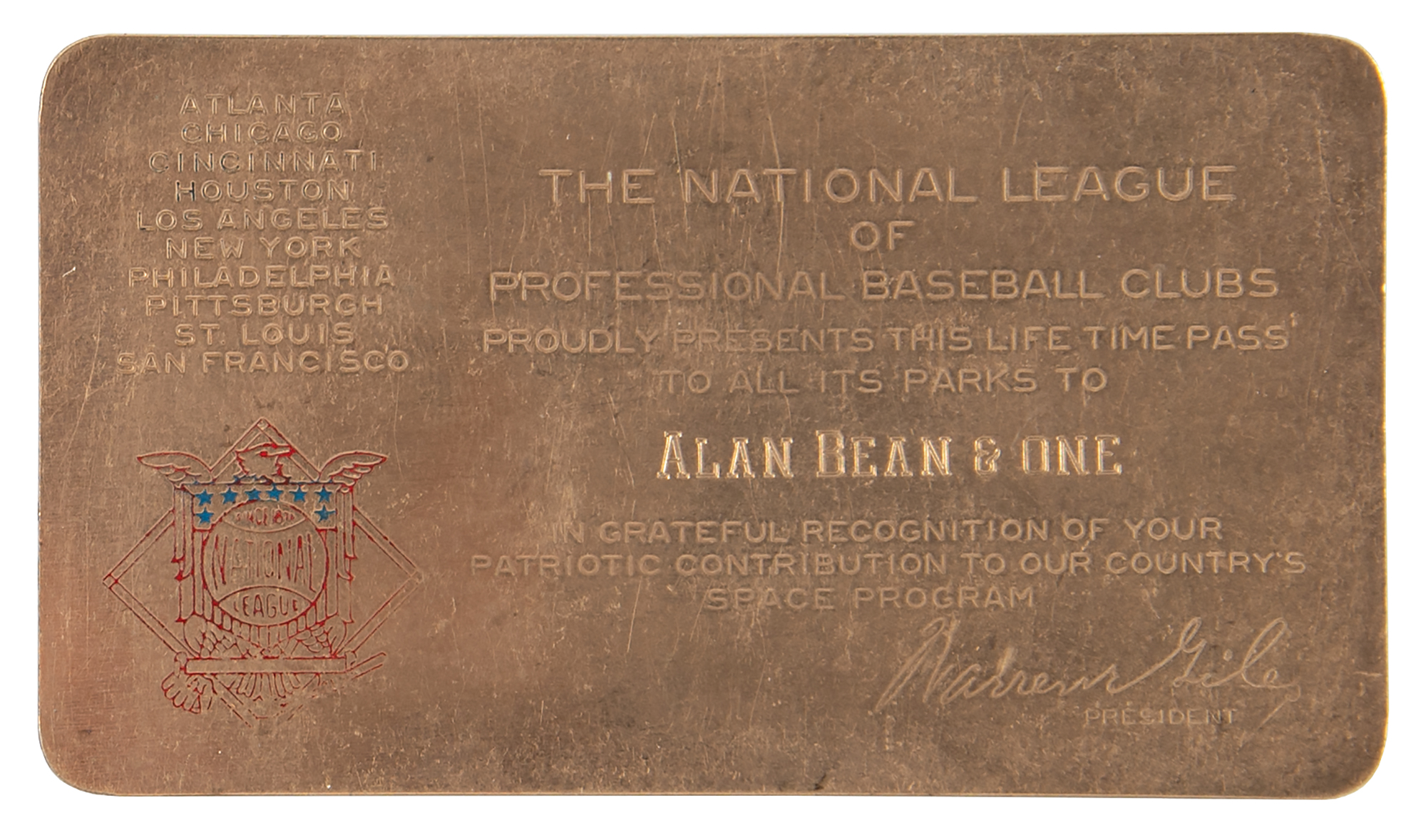 From the estate of Apollo 12 moonwalker Alan Bean—an engraved metallic lifetime pass card from the “National League of Professional Baseball Clubs,” 3.75 x 2.25, which reads: “The National League of Professional Baseball Clubs Proudly Presented This Life Time Pass to All Its Parks to Alan Bean & One In Grateful Recognition of Your Patriotic Contribution to Our Country’s Space Program.” The lower portion bears the engraved signature of National League President Warren Giles. In fine condition, with some light wear and scuffing. Accompanied by a letter of authenticity from Amy Bean, the daughter of Alan Bean.