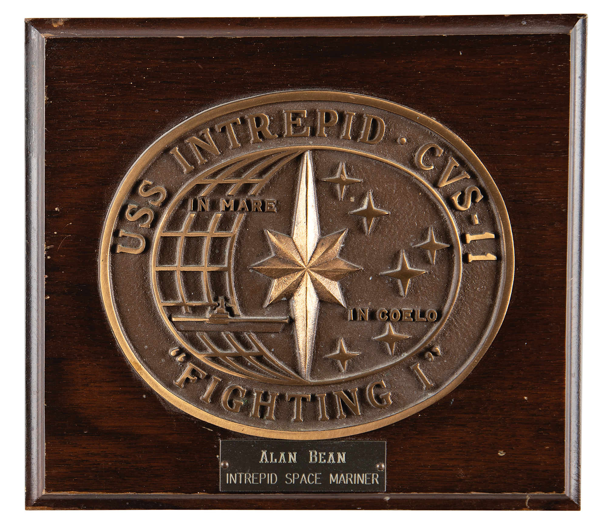 From the estate of Apollo 12 moonwalker Alan Bean—an award plaque with a bronze-tone emblem of the USS Intrepid (CV-11), an Essex-class aircraft carrier that served as a recovery ship for the Mercury and Gemini space programs. Mounted to a wooden 10 x 9 display plaque with lower engraved plate: “Alan Bean, Intrepid Space Mariner.” In fine condition, with some light wear and marks to the wooden display mount. Accompanied by a letter of authenticity from Amy Bean, the daughter of Alan Bean.