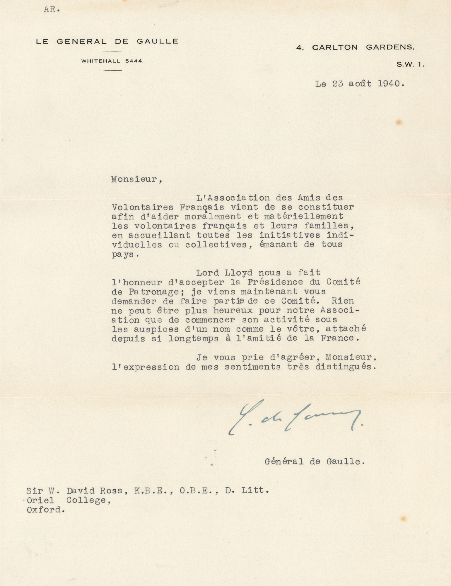 World War II-dated TLS signed “C. de Gaulle,” one page, 8 x 10.25, personal Le General de Gaulle letterhead, August 23, 1940. Letter to renowned Scottish Aristotelian philosopher and translator W. D. Ross, in full (translated): “The Association of Friends of French Volunteers has just been formed in order to morally and materially help French volunteers and their families, by welcoming all individual or collective initiatives from all countries. Lord Lloyd has done us the honor of accepting the Presidency of the Patronage Committee; I now come to ask you to be part of this Committee. Nothing can be happier for our Association than to begin its activity under the auspices of a name like yours, attached for so long to the friendship of France. Please accept, Sir, the expression of my very distinguished feelings.” In fine condition.