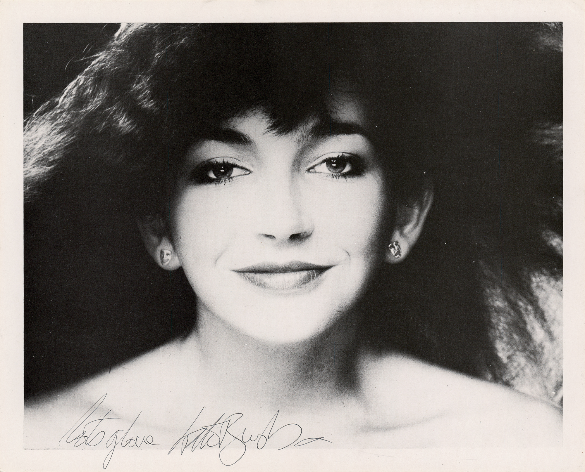 Glossy 10 x 8 double-weight promotional photo of Kate Bush in a lovely up-close pose, signed in black ballpoint, "Lots of love, Kate Bush, x." In fine condition.
