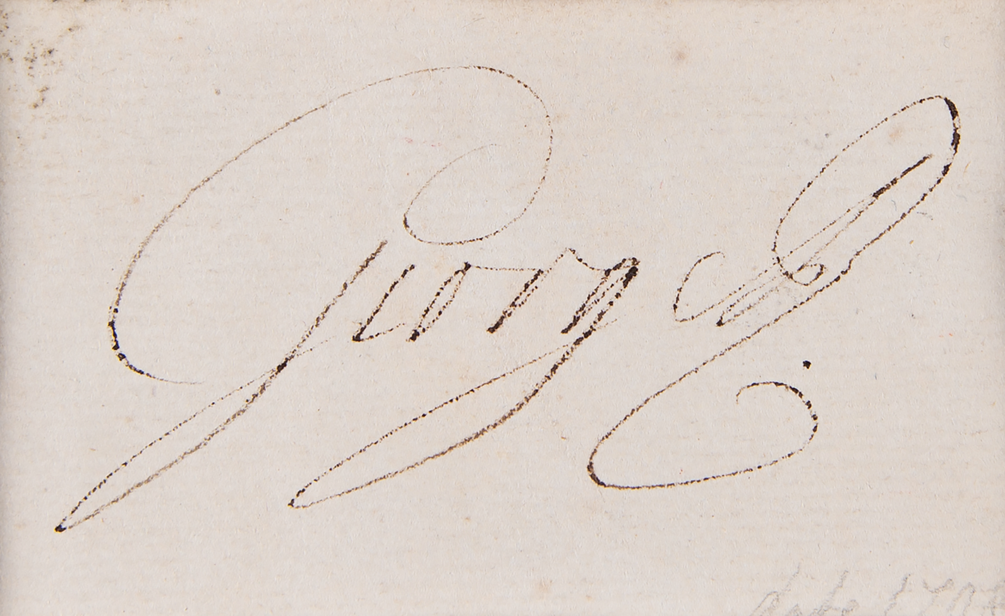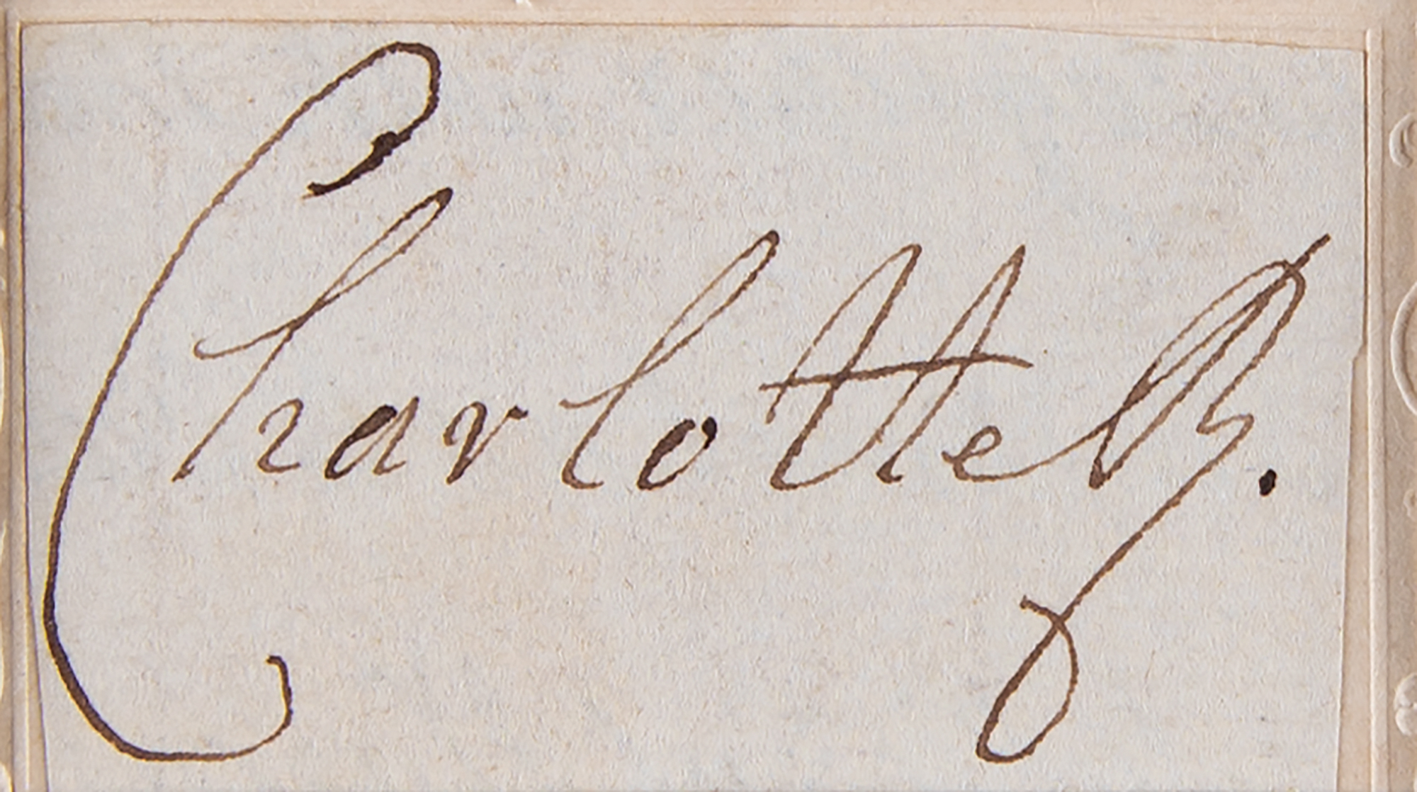Attractive ink signatures of King George III, “George R.,” and Charlotte of Mecklenburg-Strelitz, “Charlotte R.,” on individual off-white slips ranging in size from 1.75 x 1 to 3.25 x 2. Double-matted together with color portraits to an overall size of 12.5 x 12.75. In overall fine condition.
