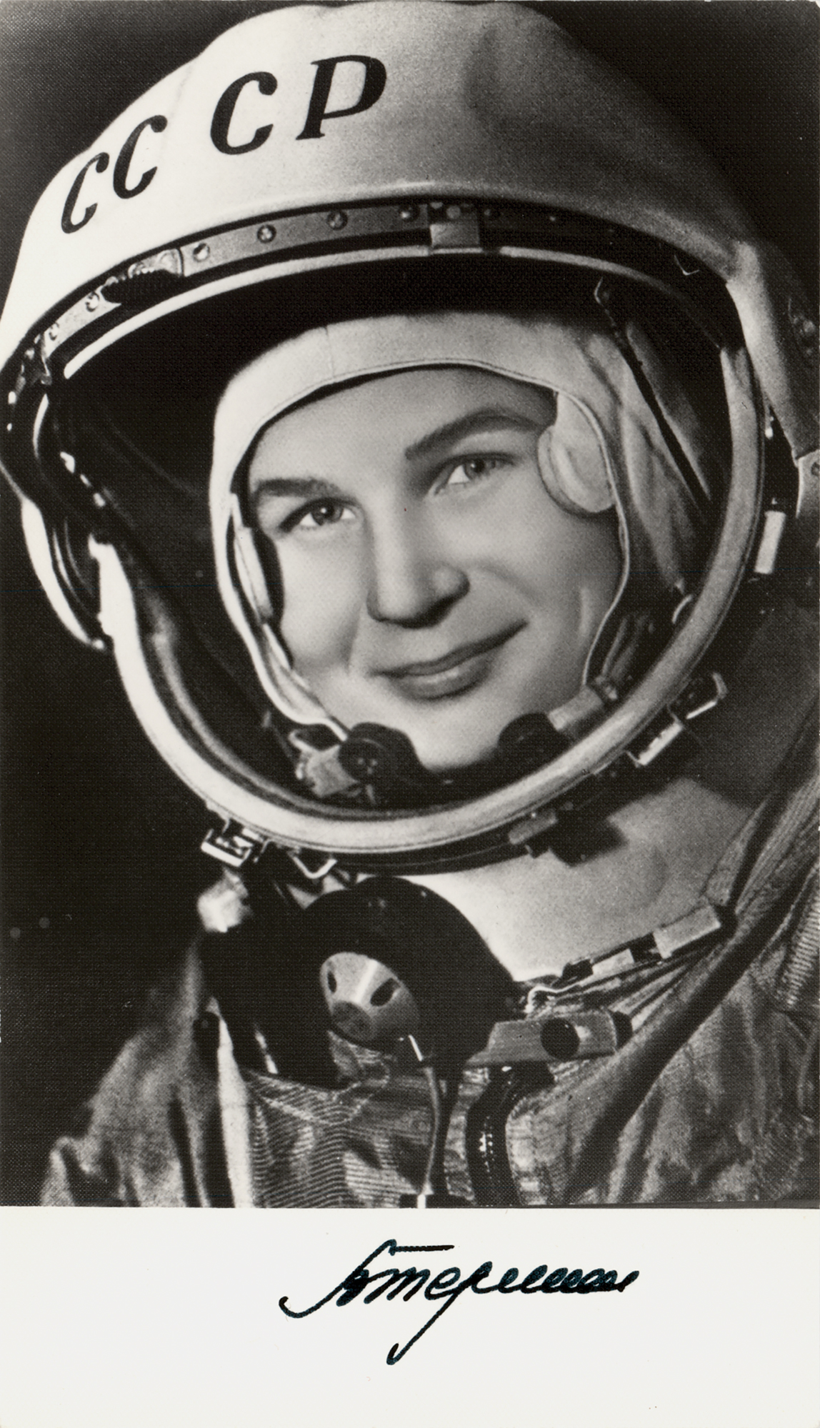 Semi-glossy 3.75 x 6.75 photo of Valentina Tereshkova smiling in her Vostok space suit, signed in the lower border in black ink in Cyrillic. In very fine condition.