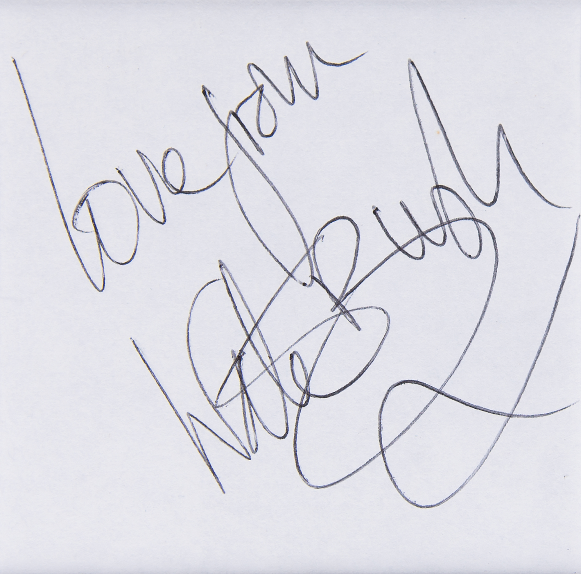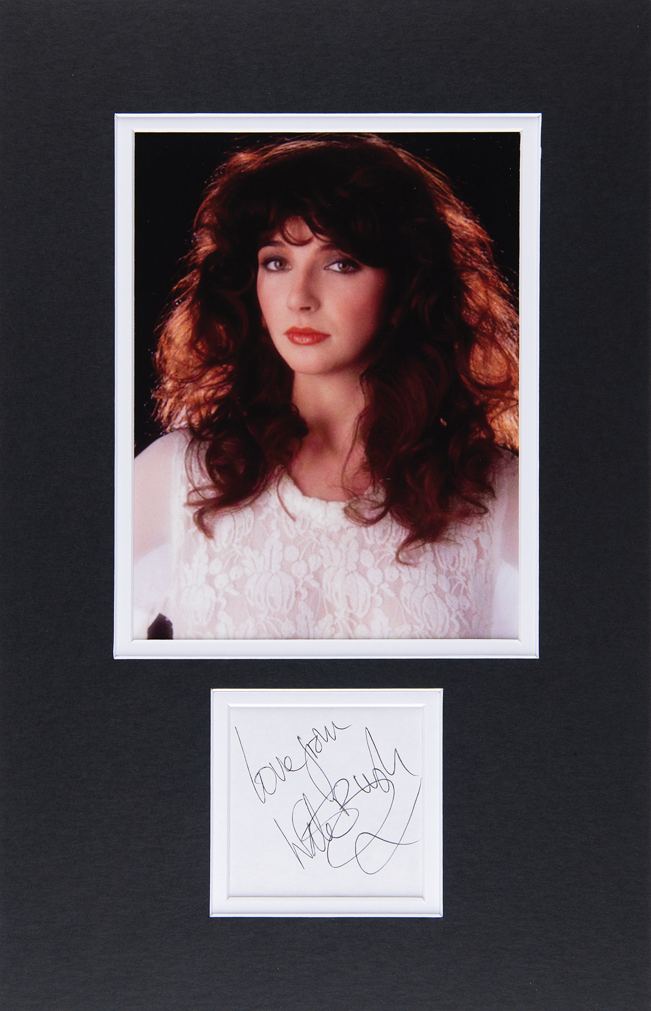 Ballpoint signature, "Love from, Kate Bush,” on an off-white 2.75 x 2.75 sheet. Double-matted with a lovely color photo to an overall size of 9.75 x 15.25. In very fine condition.