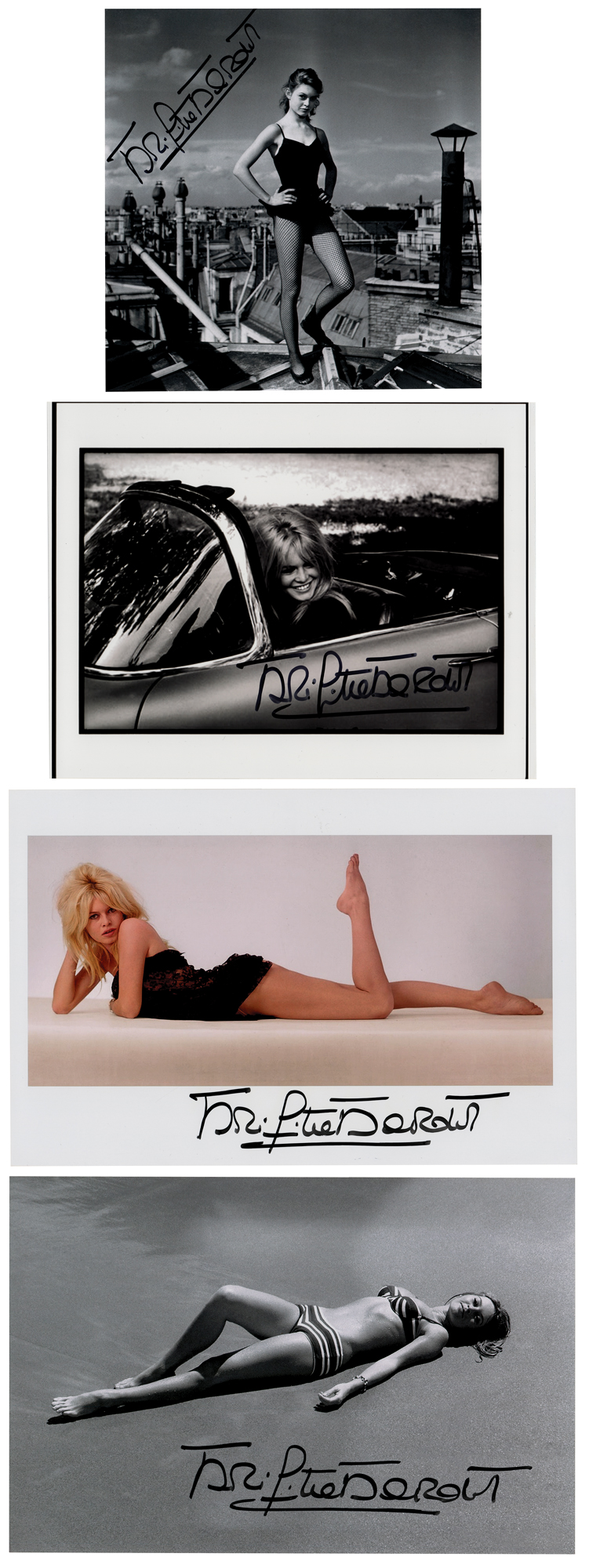 Four different glossy photos of Brigitte Bardot, ranging in size from 8 x 8 to 12 x 8, each signed in black felt tip by the blonde starlet. In overall very fine condition.